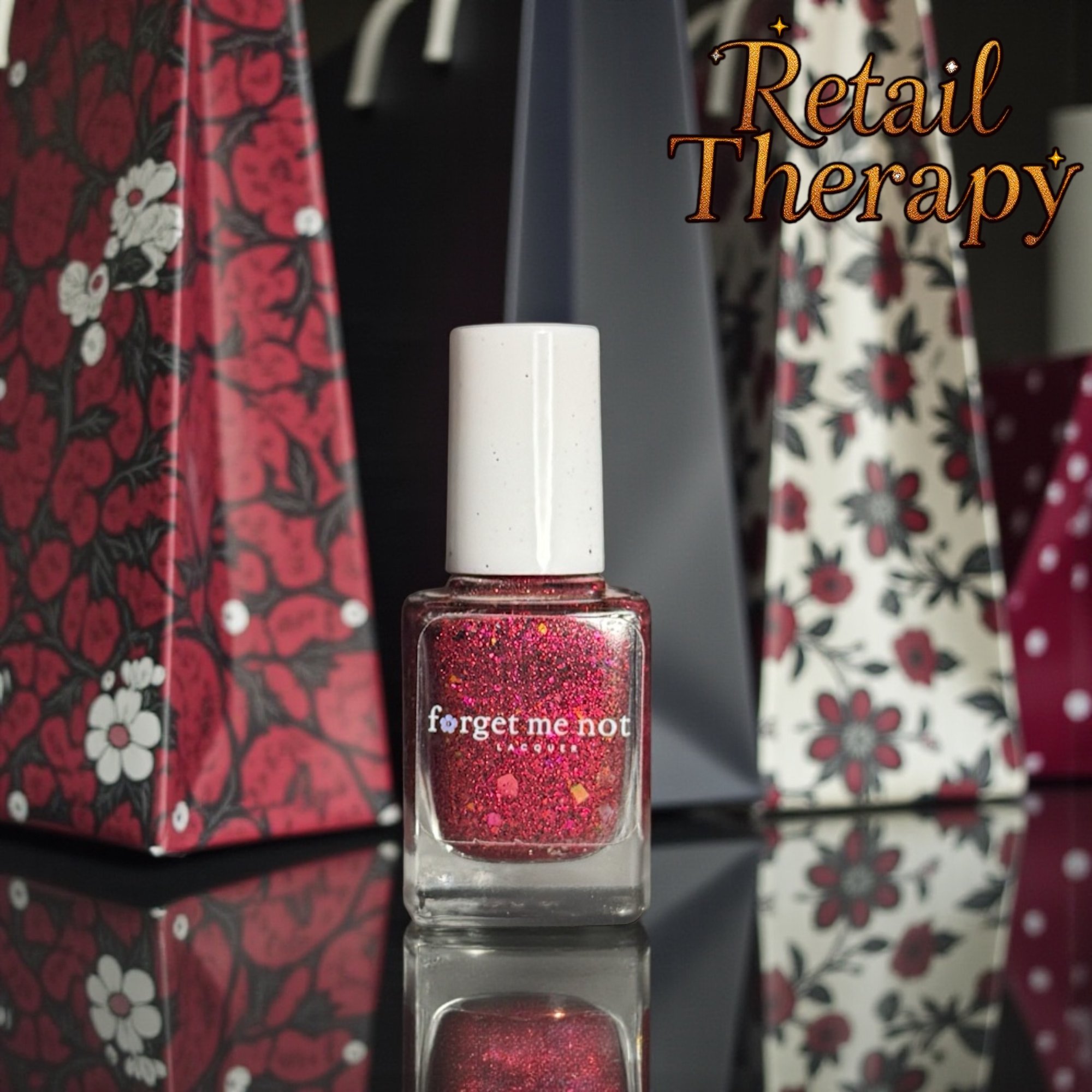 Ignite your holiday spirit with Retail Therapy, a vibrant pinkish red jelly polish that's as explosive as all the holiday shopping. This festive shade is packed with a dazzling array of multi-colored flakes and black flecks, creating a mesmerizing, almost firework-like effect. A subtle large particle red shimmer that creates an orange flip adds a touch of glamour, making it the perfect polish to celebrate the season.