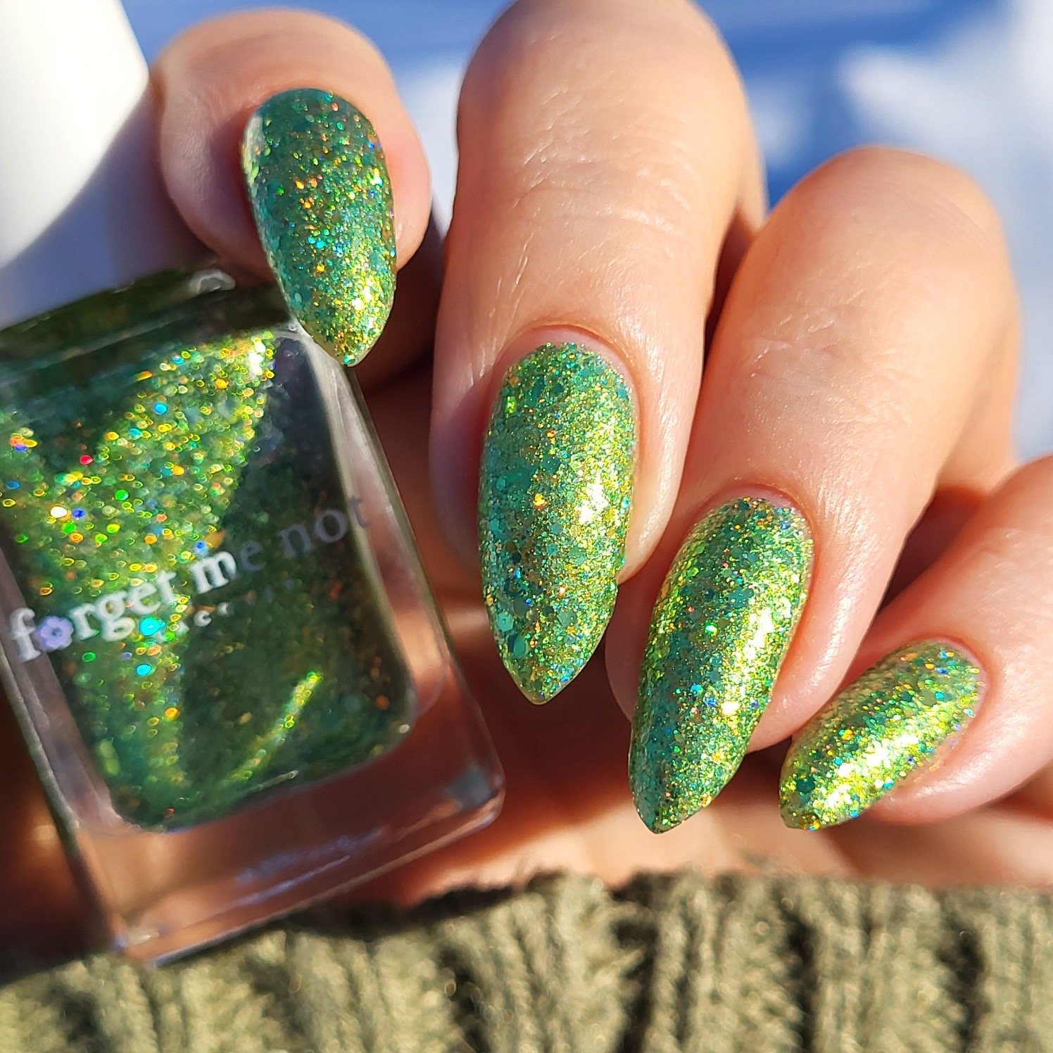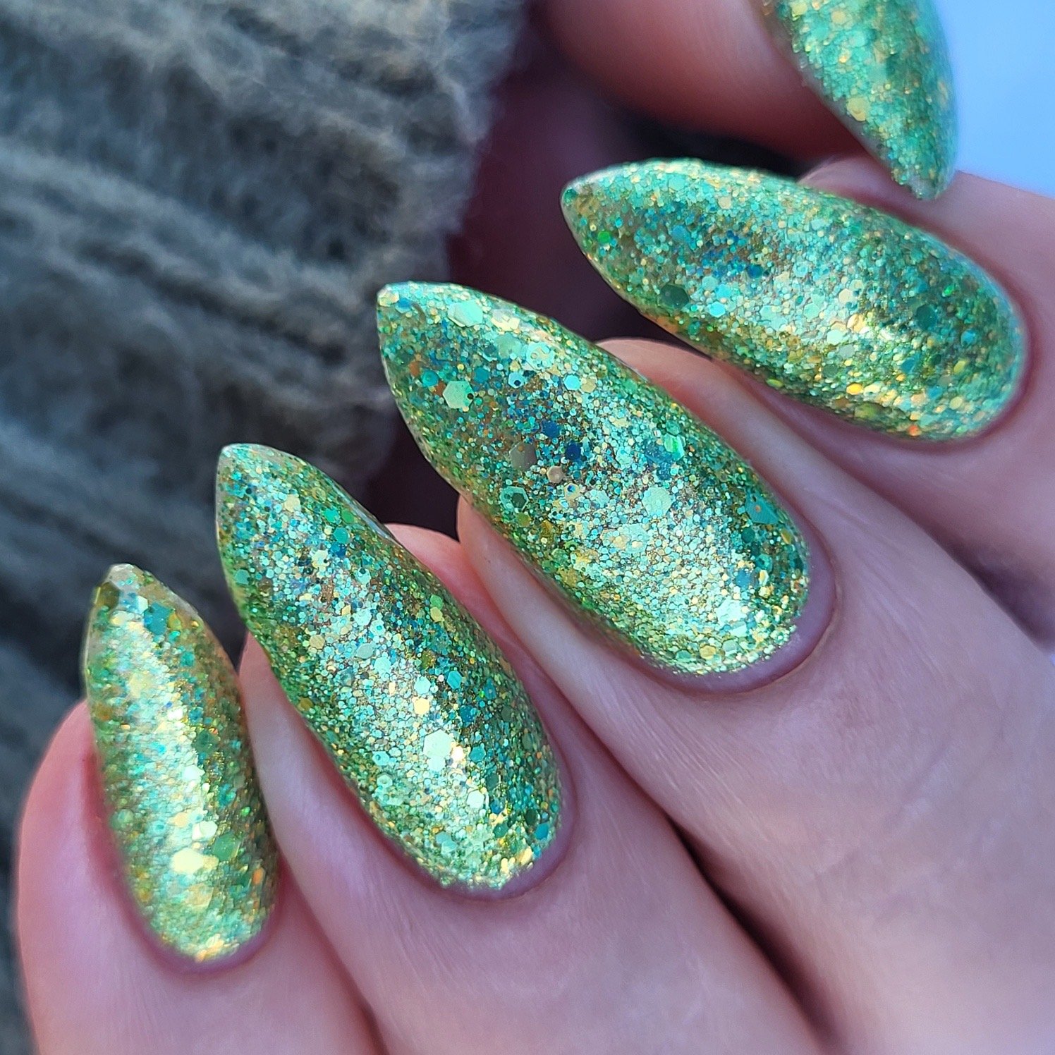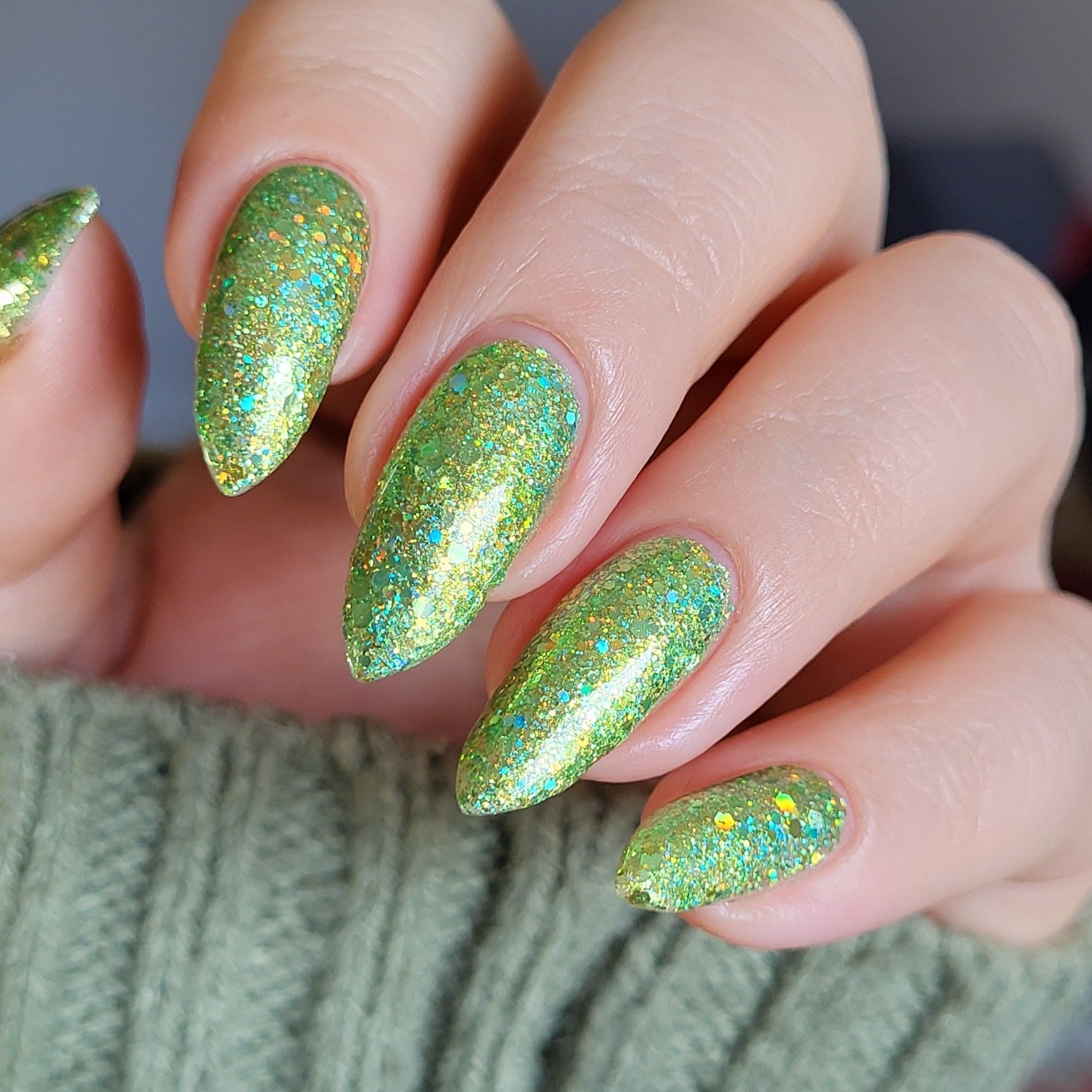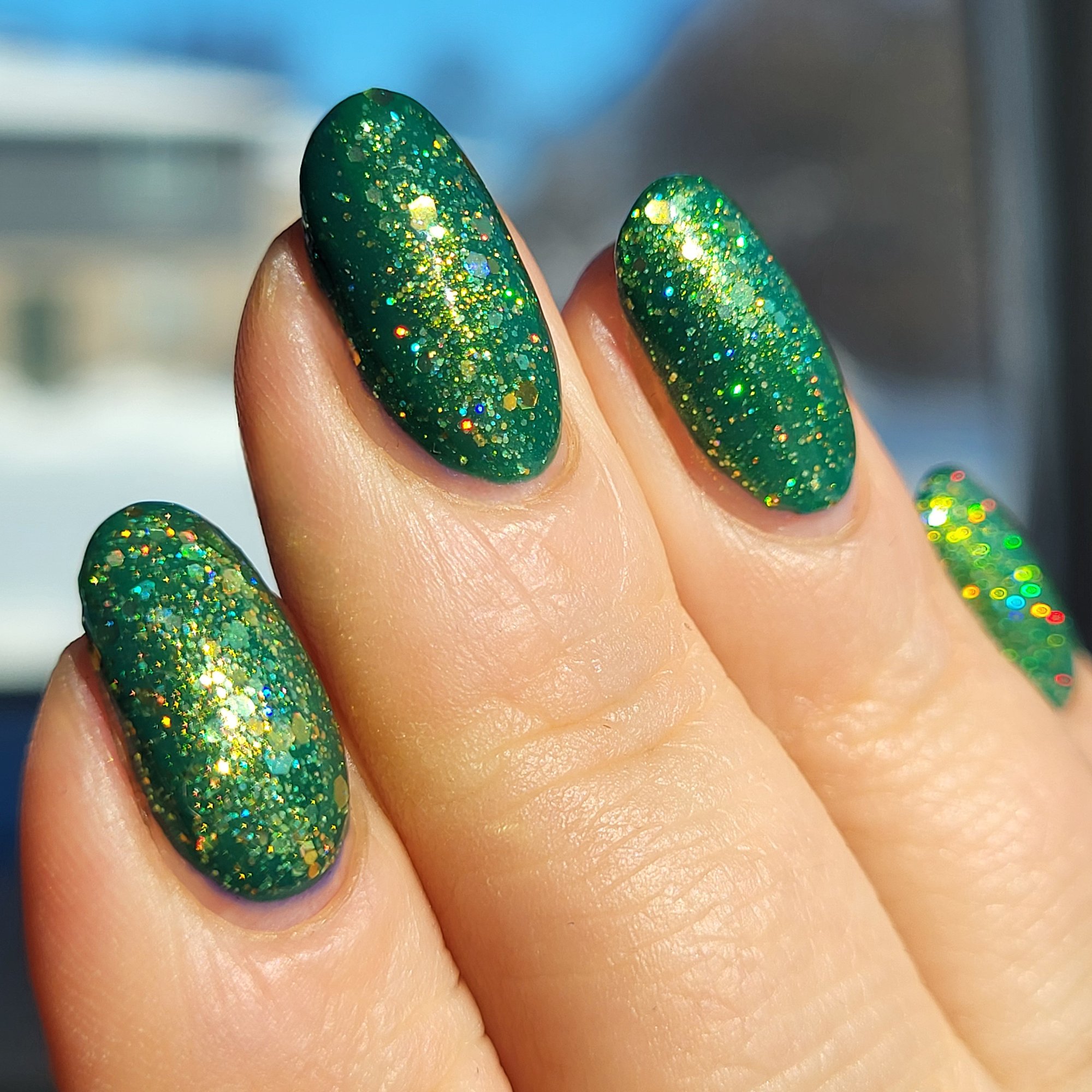 This vibrant green holographic glitter polish is packed with layers of shimmering green holo, scattered with touches of radiant gold for a festive, treasure-like glow. Tiny holographic green glitters fill every space, creating a richly sparkling finish that catches the light from every angle. A beautiful green to gold shimmer plays wonderfully in the sun!