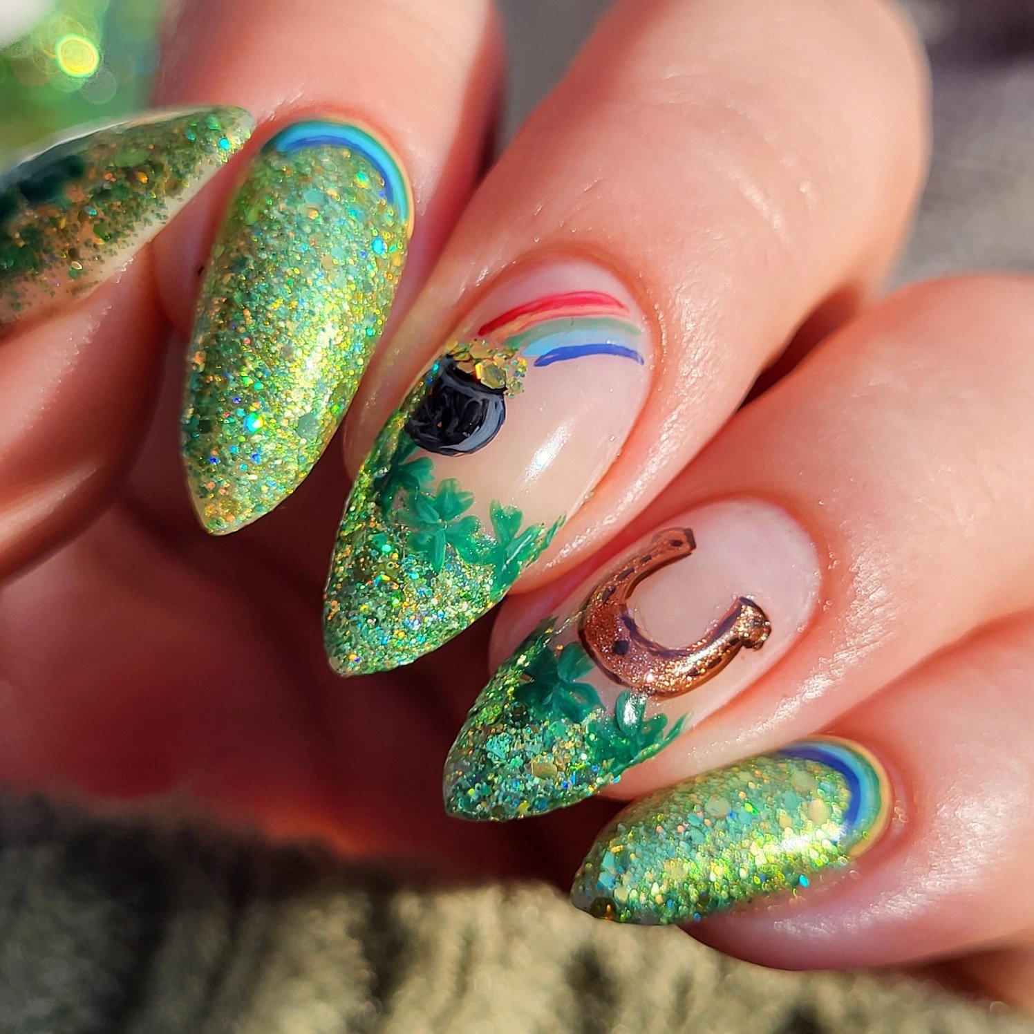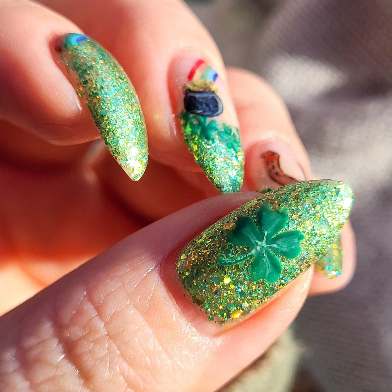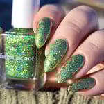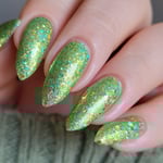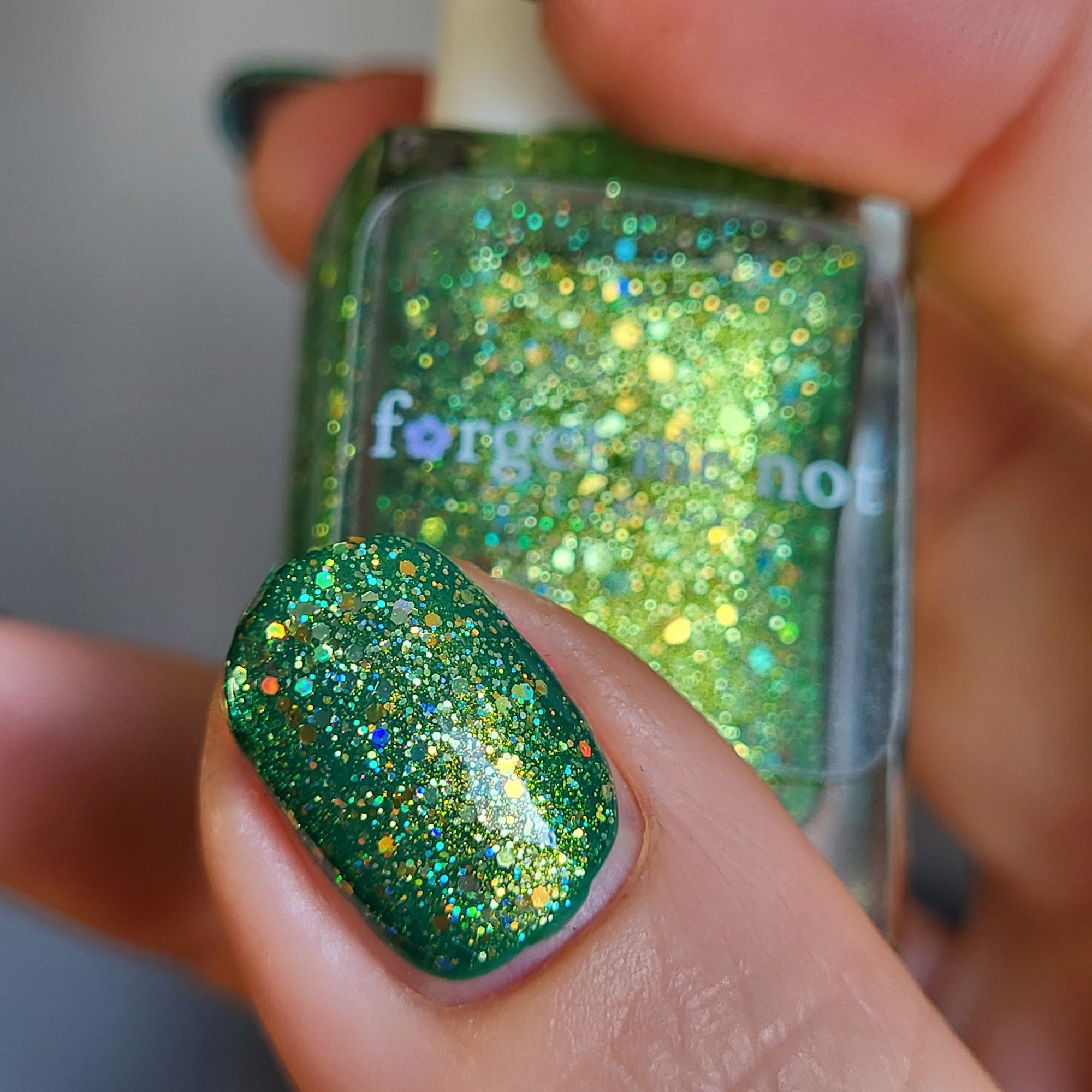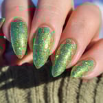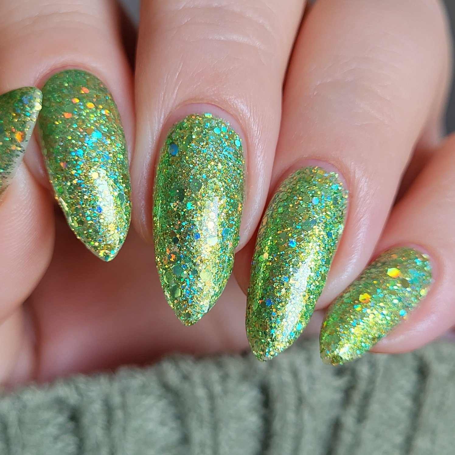This vibrant green holographic glitter polish is packed with layers of shimmering green holo, scattered with touches of radiant gold for a festive, treasure-like glow. Tiny holographic green glitters fill every space, creating a richly sparkling finish that catches the light from every angle. A beautiful green to gold shimmer plays wonderfully in the sun!