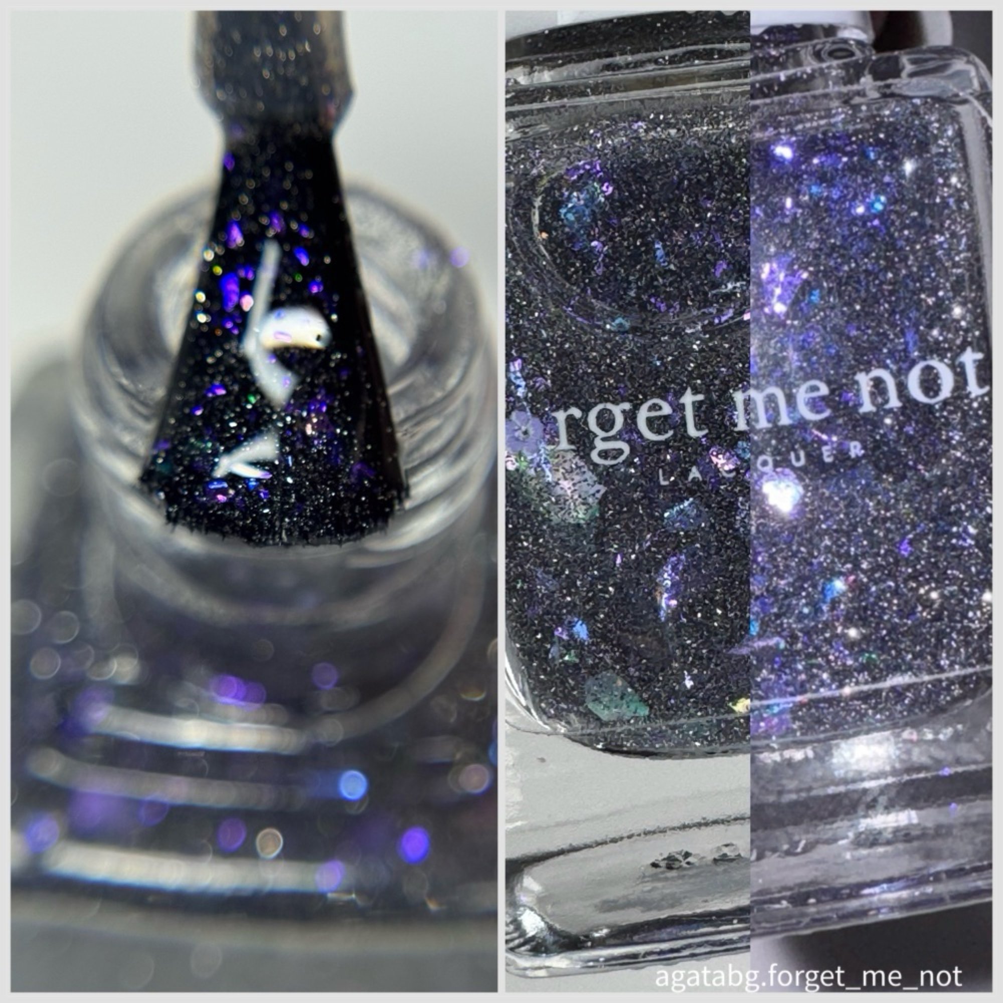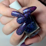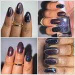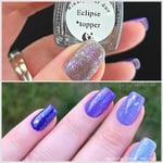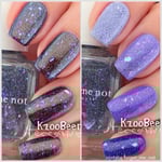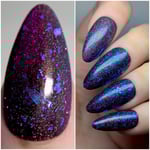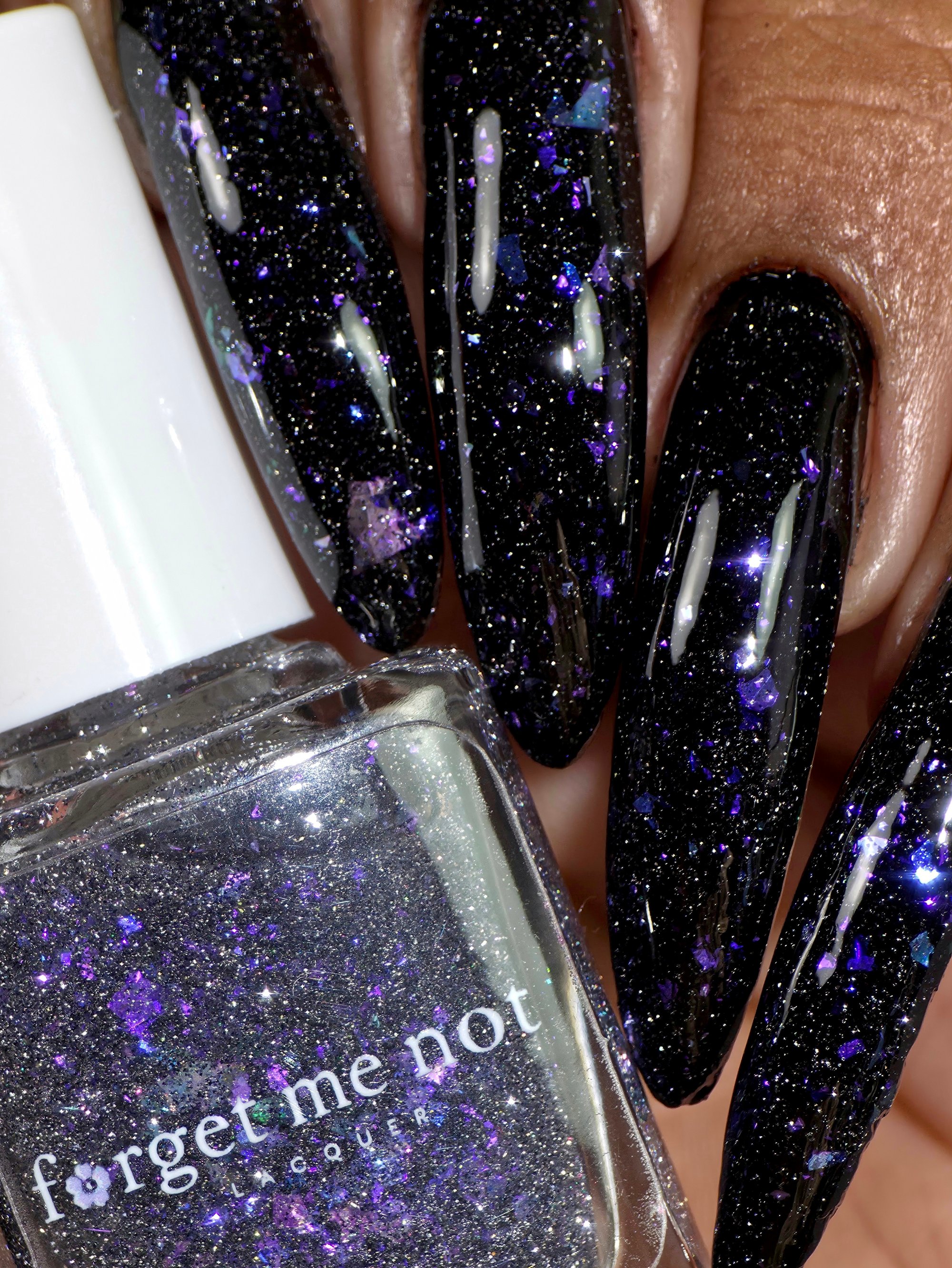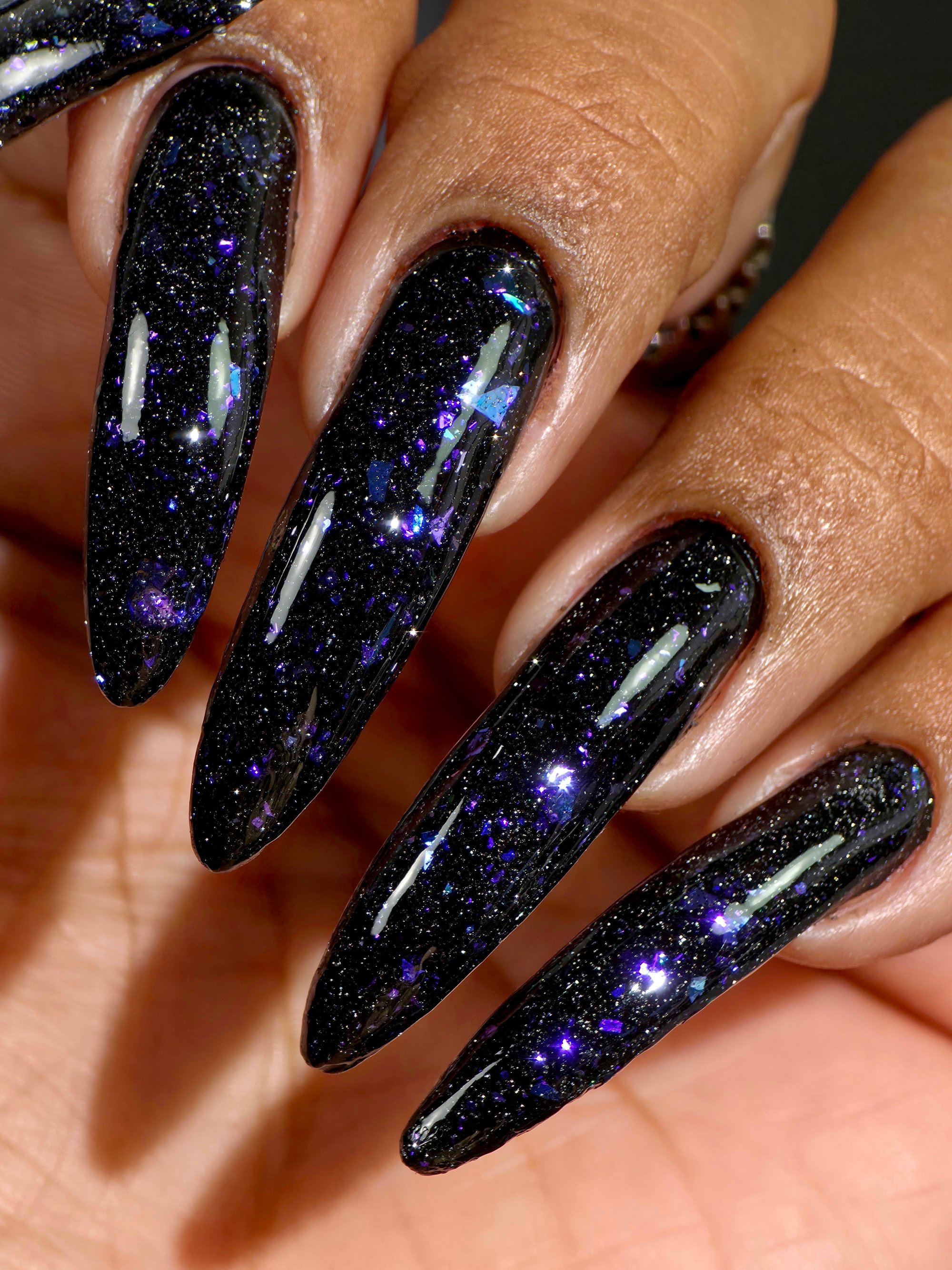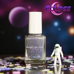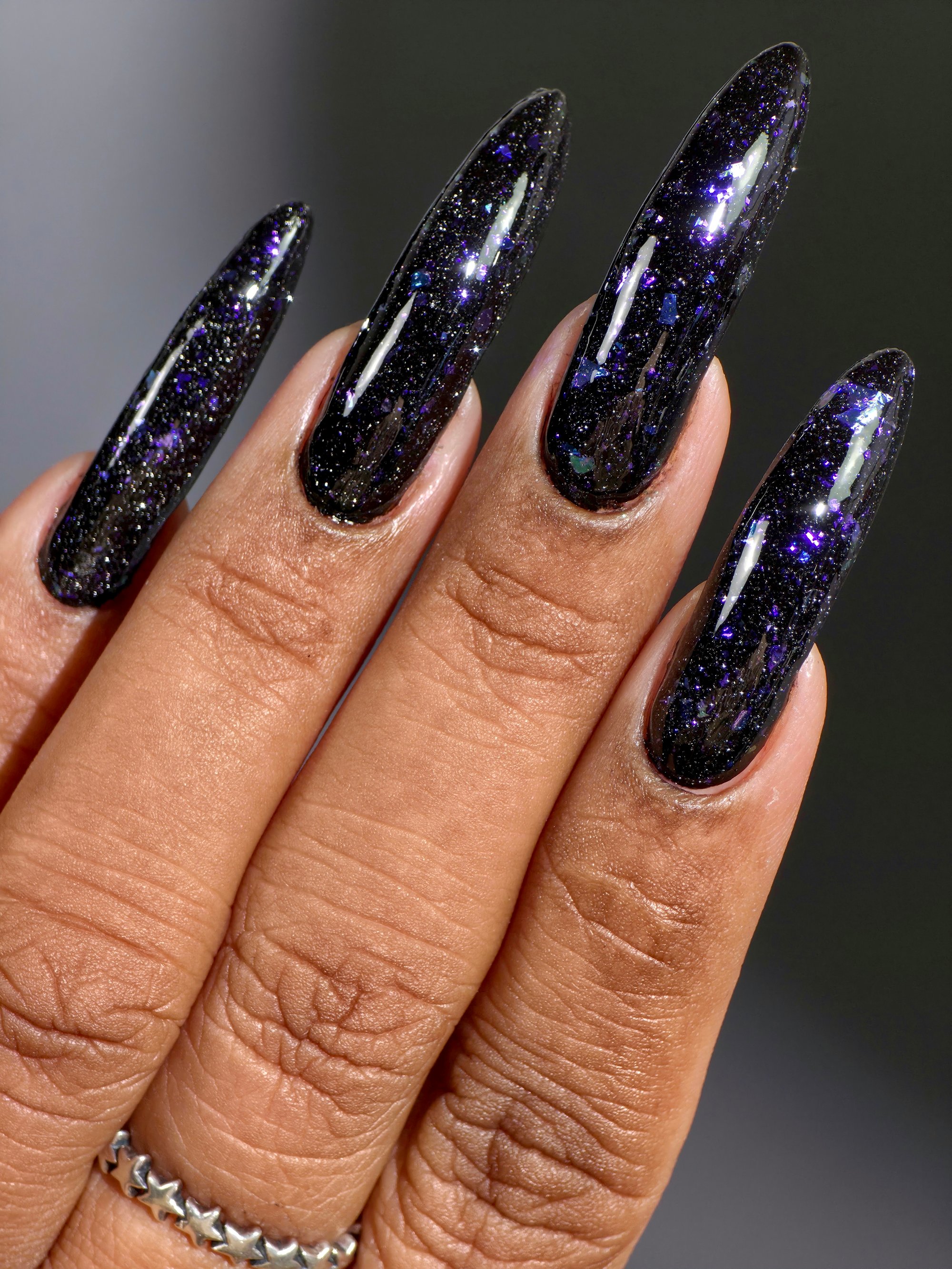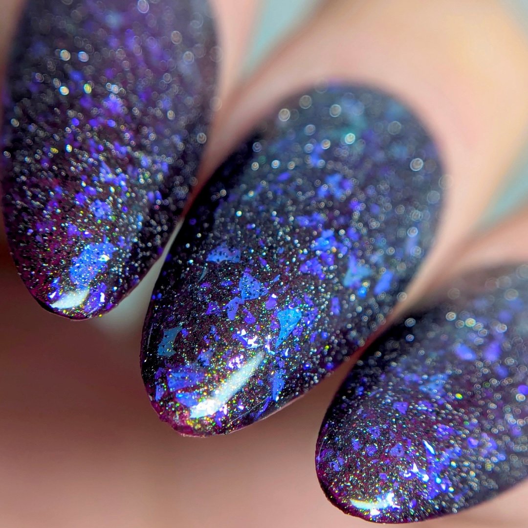 Experience a total transformation with this celestial topper. A raven-black reflective glitter bed creates a dense, sparkling darkness, while enchanting flakes flash from deep purple to a vibrant, electric aqua. Wear it over Orbit II, alone for a sheer, starry night effect or layer it over your favorite creams.