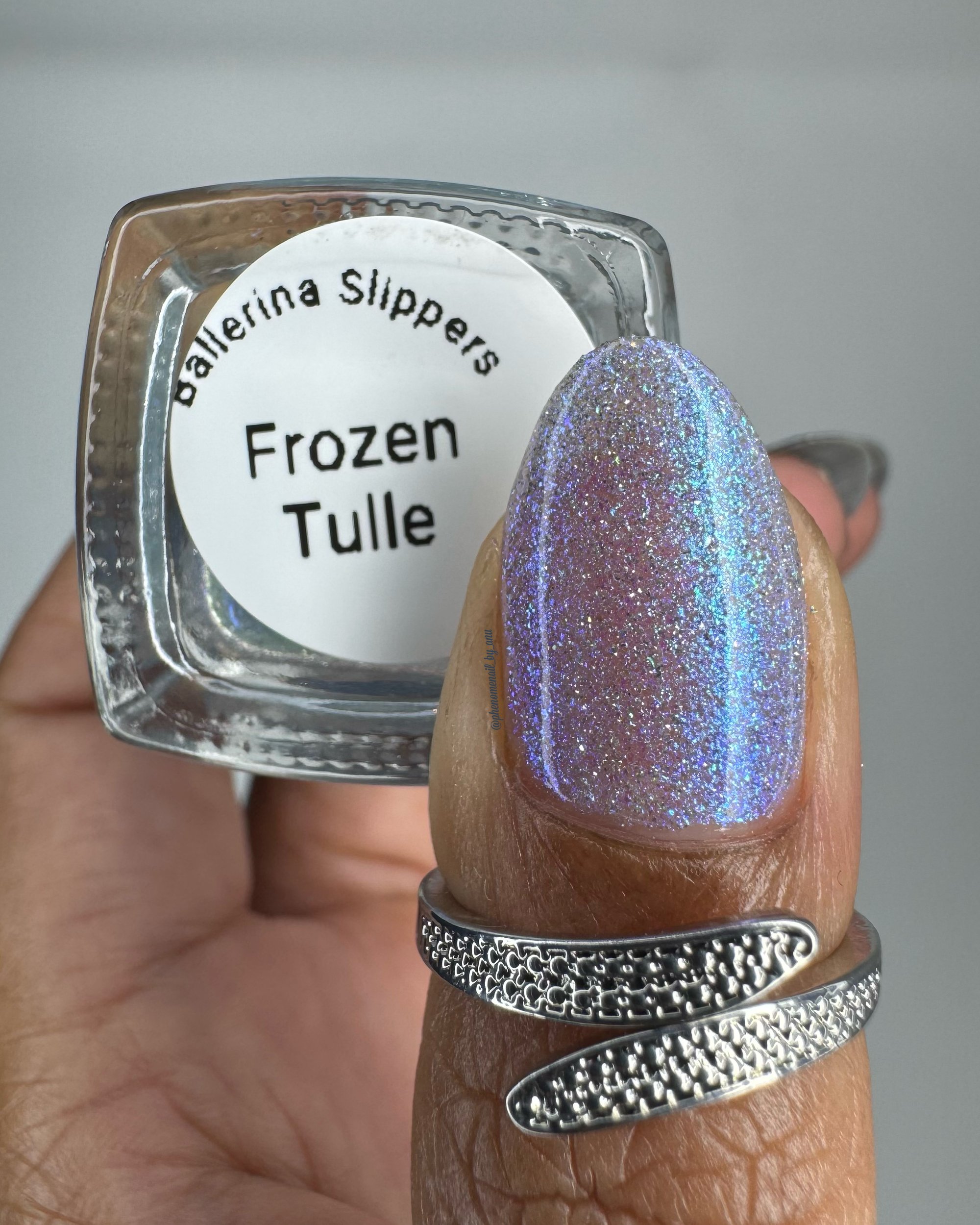 Inspired by Swan Lake and frosted morning rehearsals, Frozen Tulle is an airy powder blue kissed that shifts to stunning lavender. Silver reflective glitter catches light like crystals on winter fabric. Delicate yet eye-catching, shifty from cool blues to purples and soft pinks. It’s the cool breath of winter woven into chiffon.