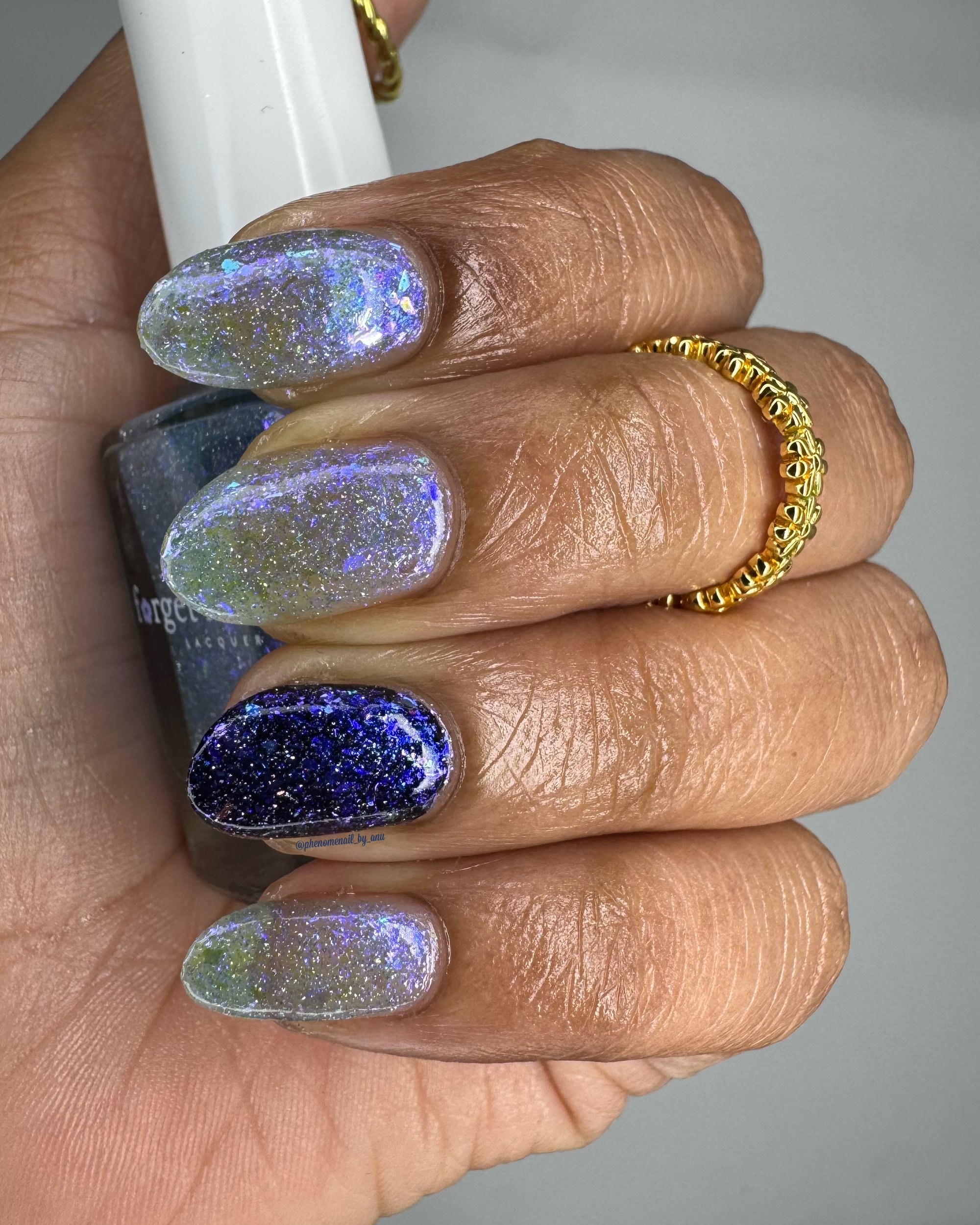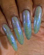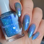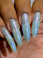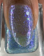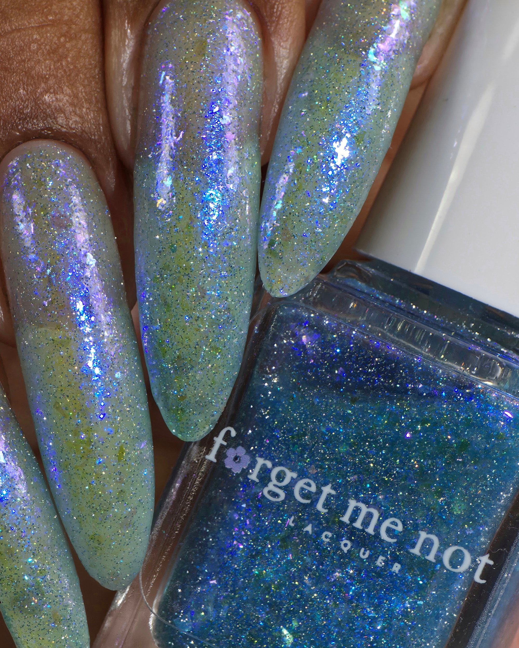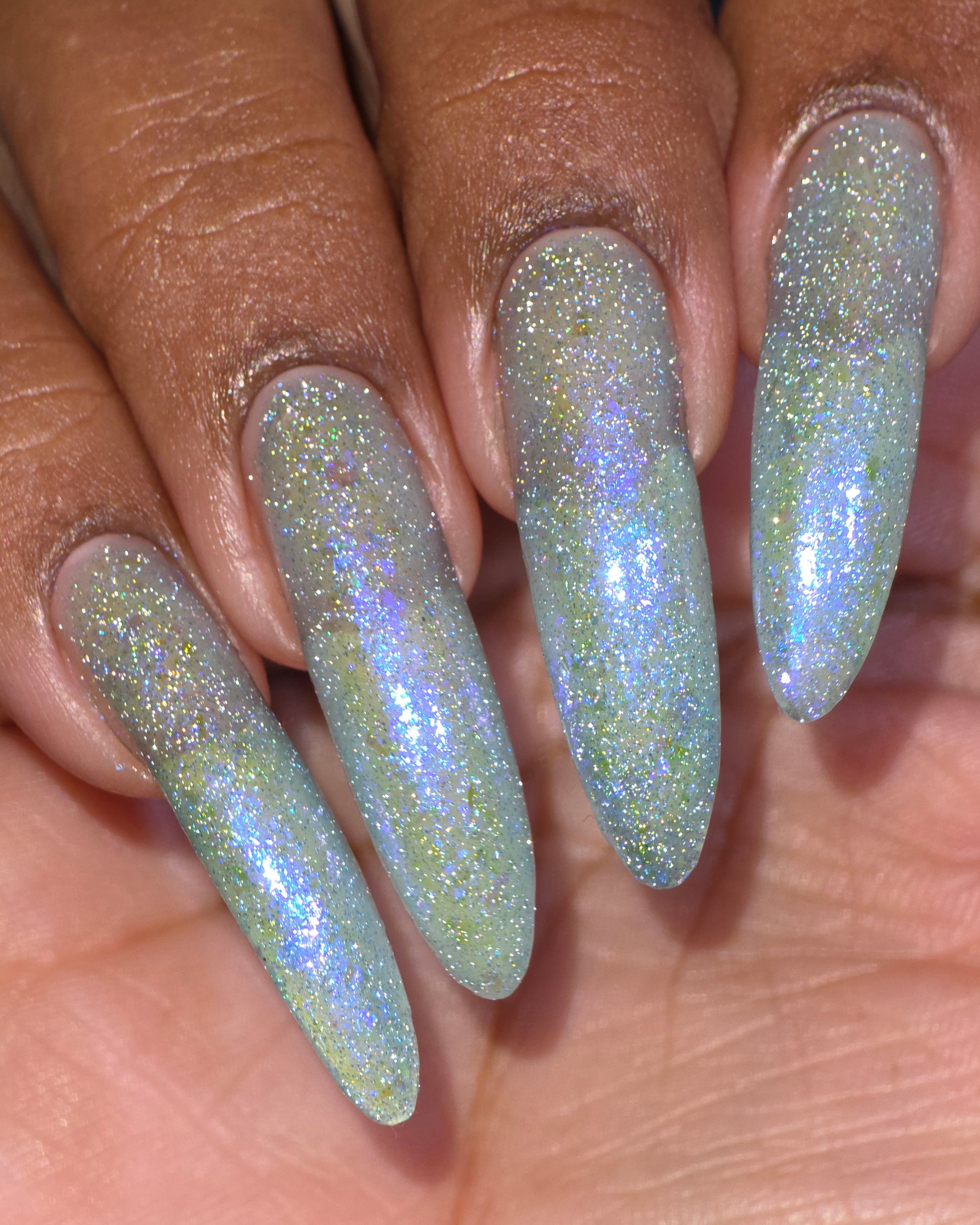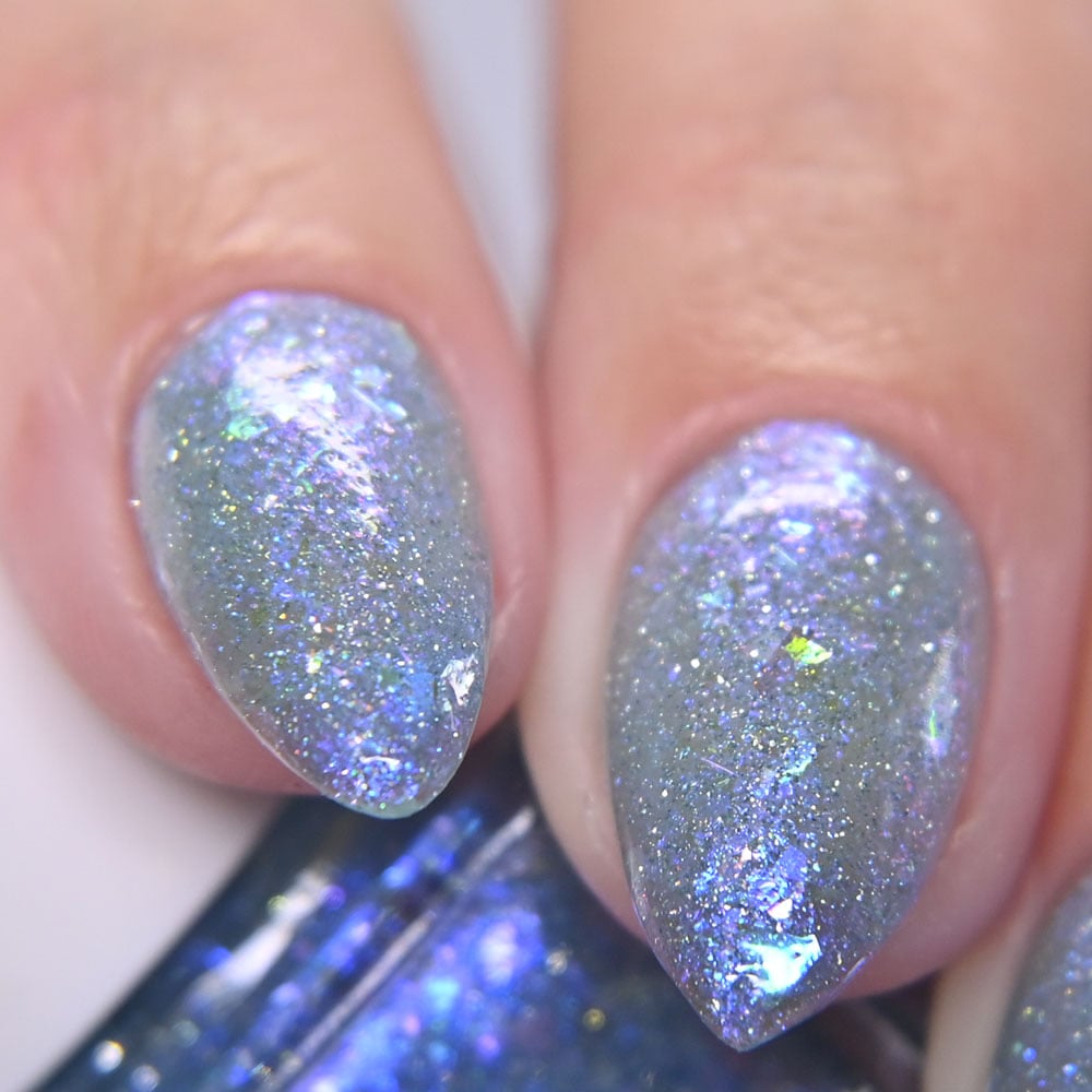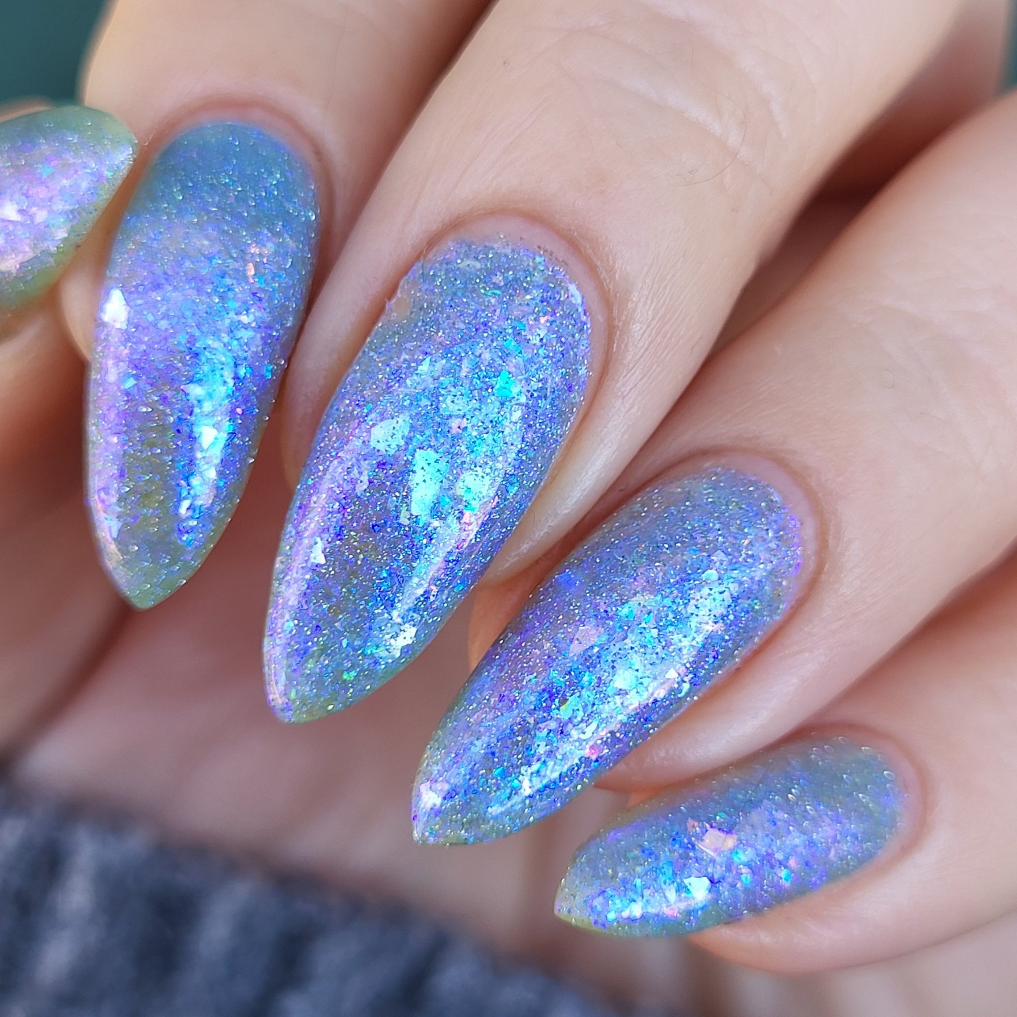 A softly tinted blue base illuminated with an airy aurora glow. Layered shifting flakes drift beneath the surface, while delicate holographic accents and subtle flashes of reflective sparkle catch the light like morning dew.