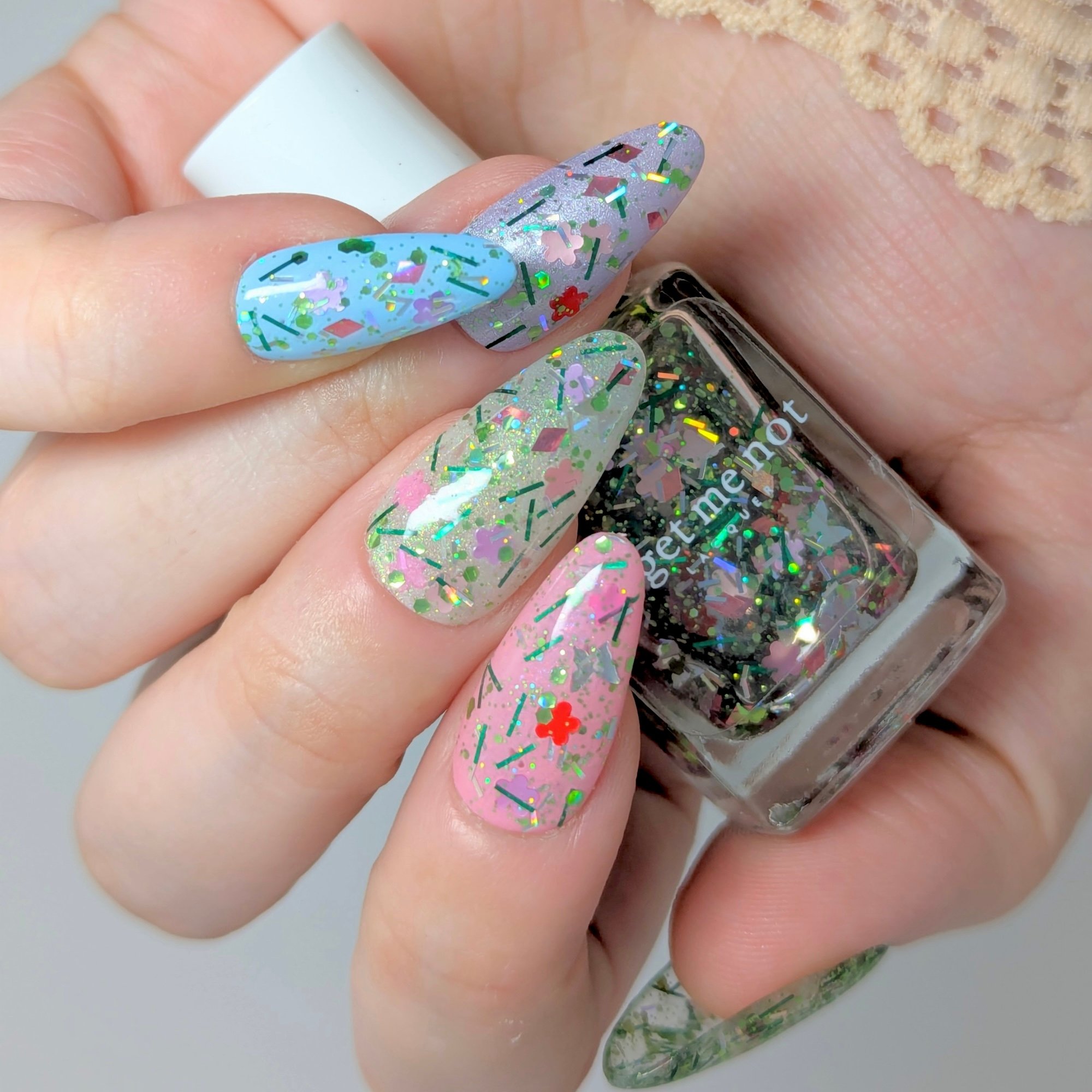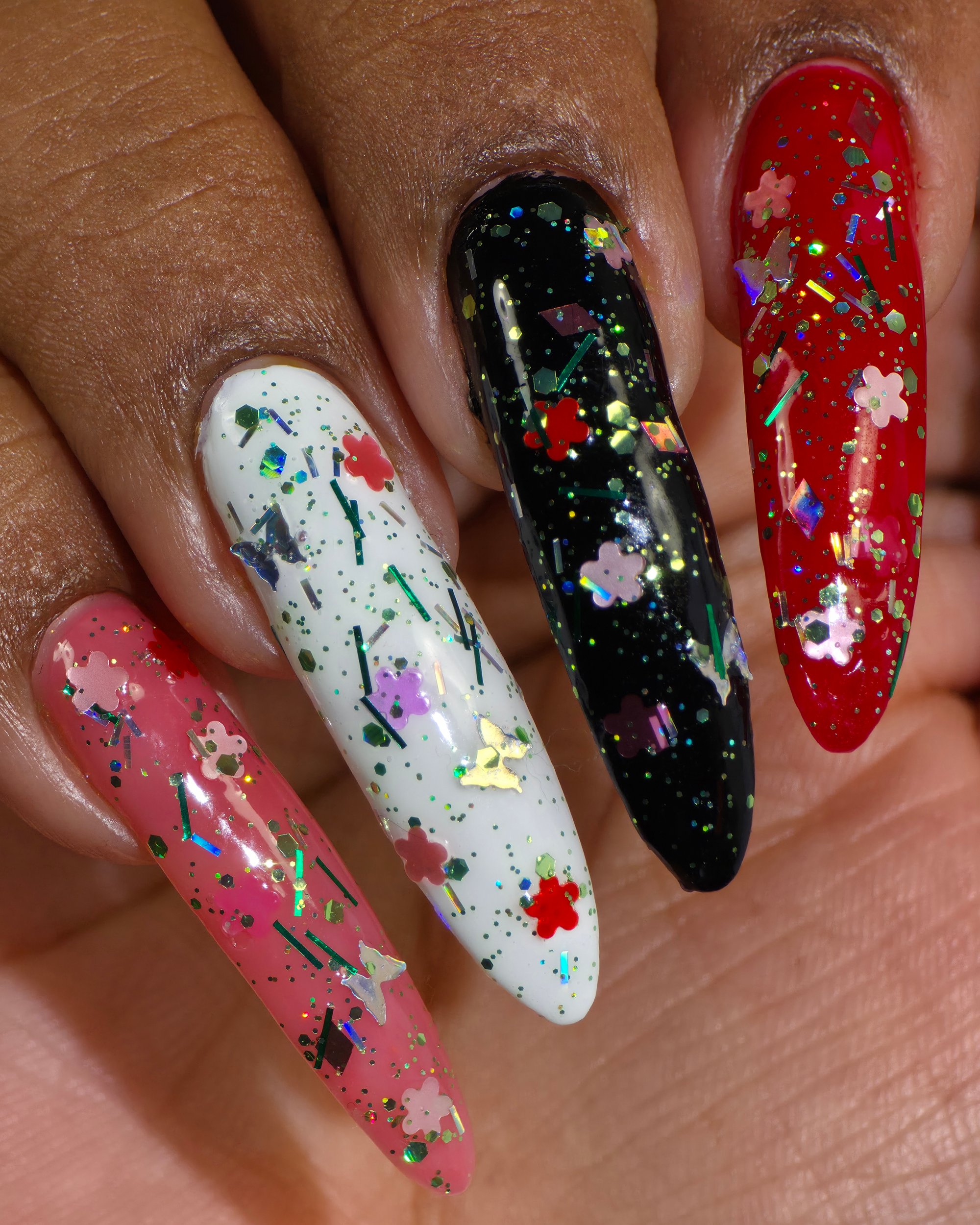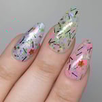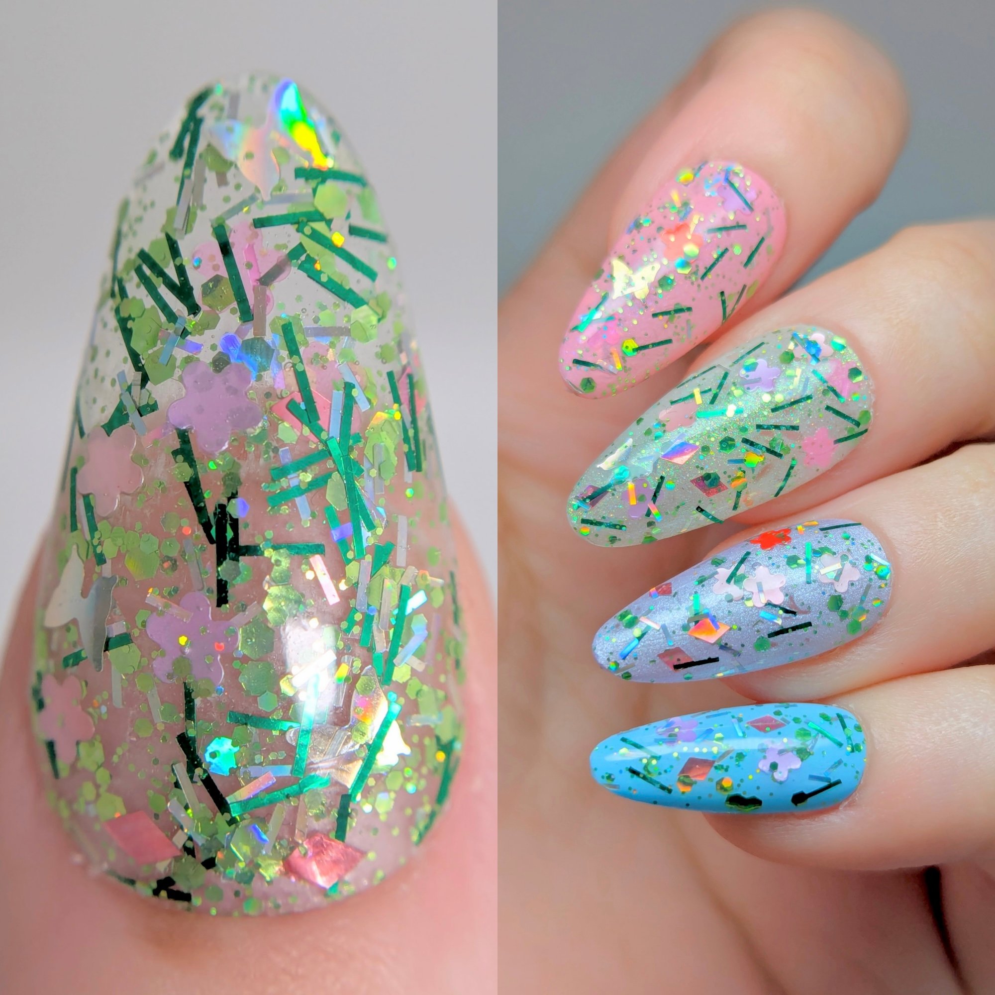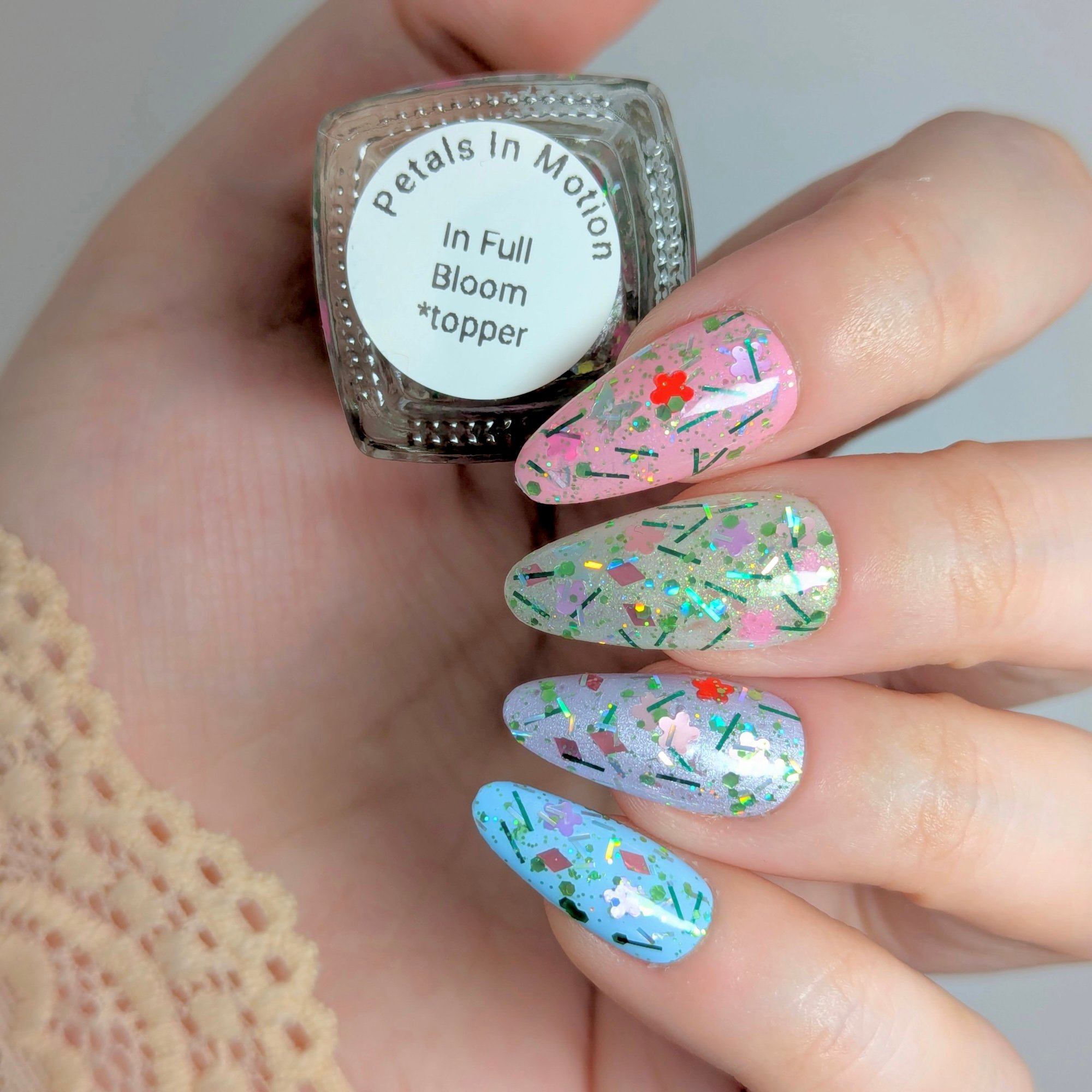 A joyful floral topper filled with tiny petals of spring. Shades of pink, red, and purple blossoms drift through a clear base alongside flashes of green holographic sparkle, airy silver and green shreds, delicate kite and butterflies shaped glitters that dance across the nail.