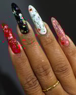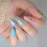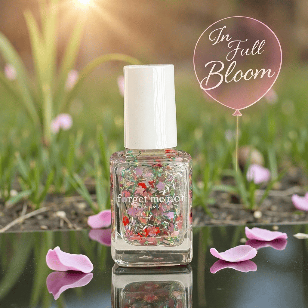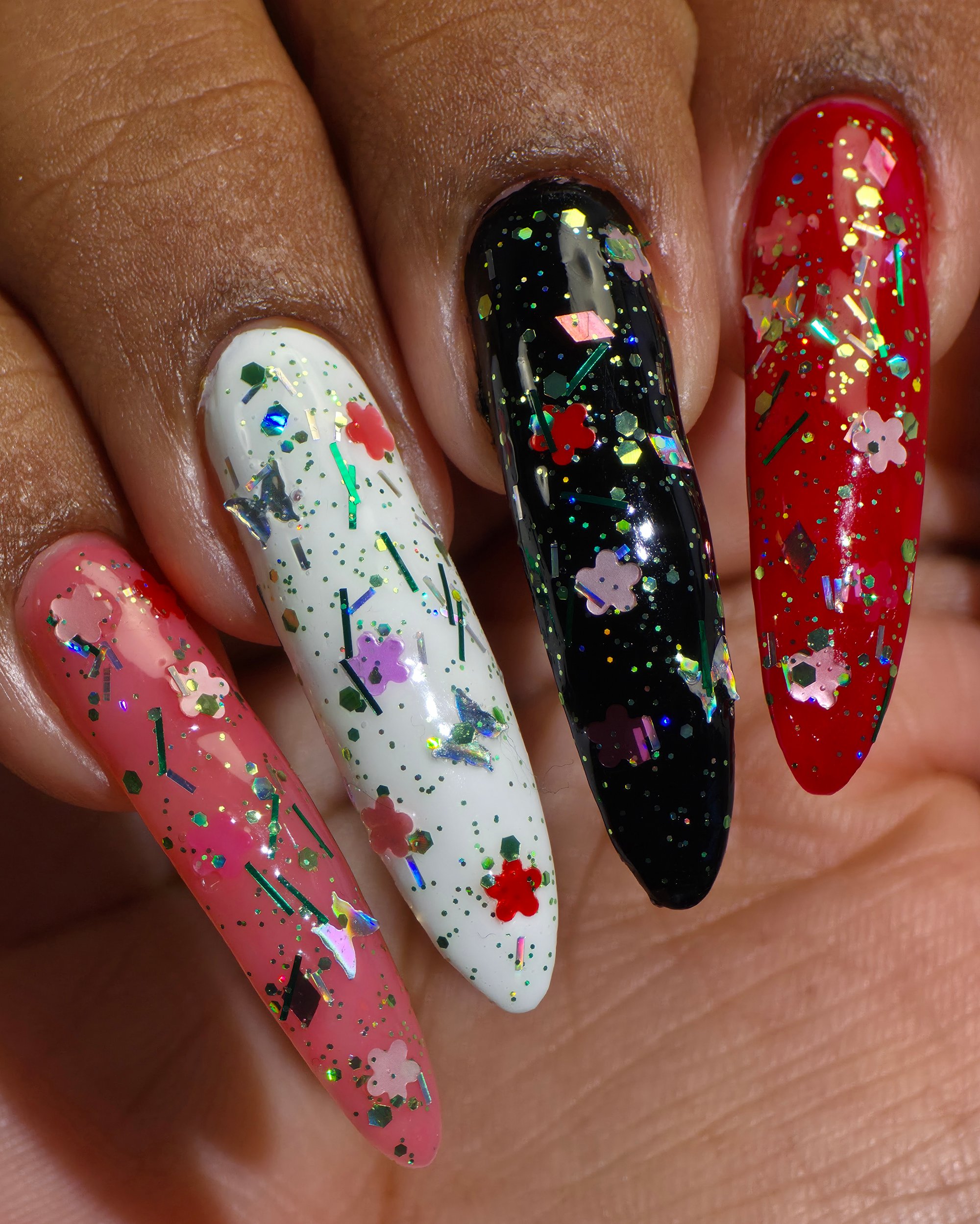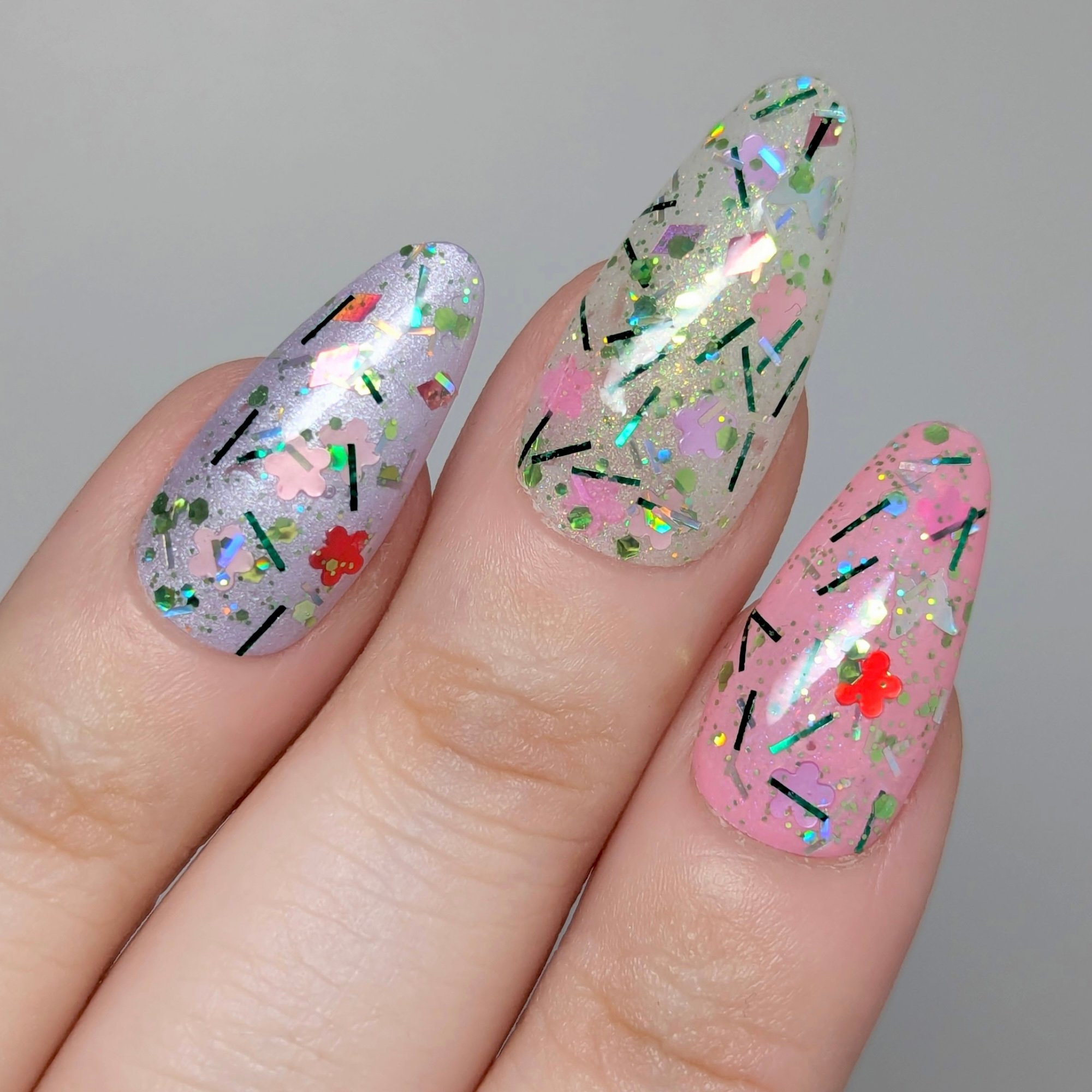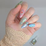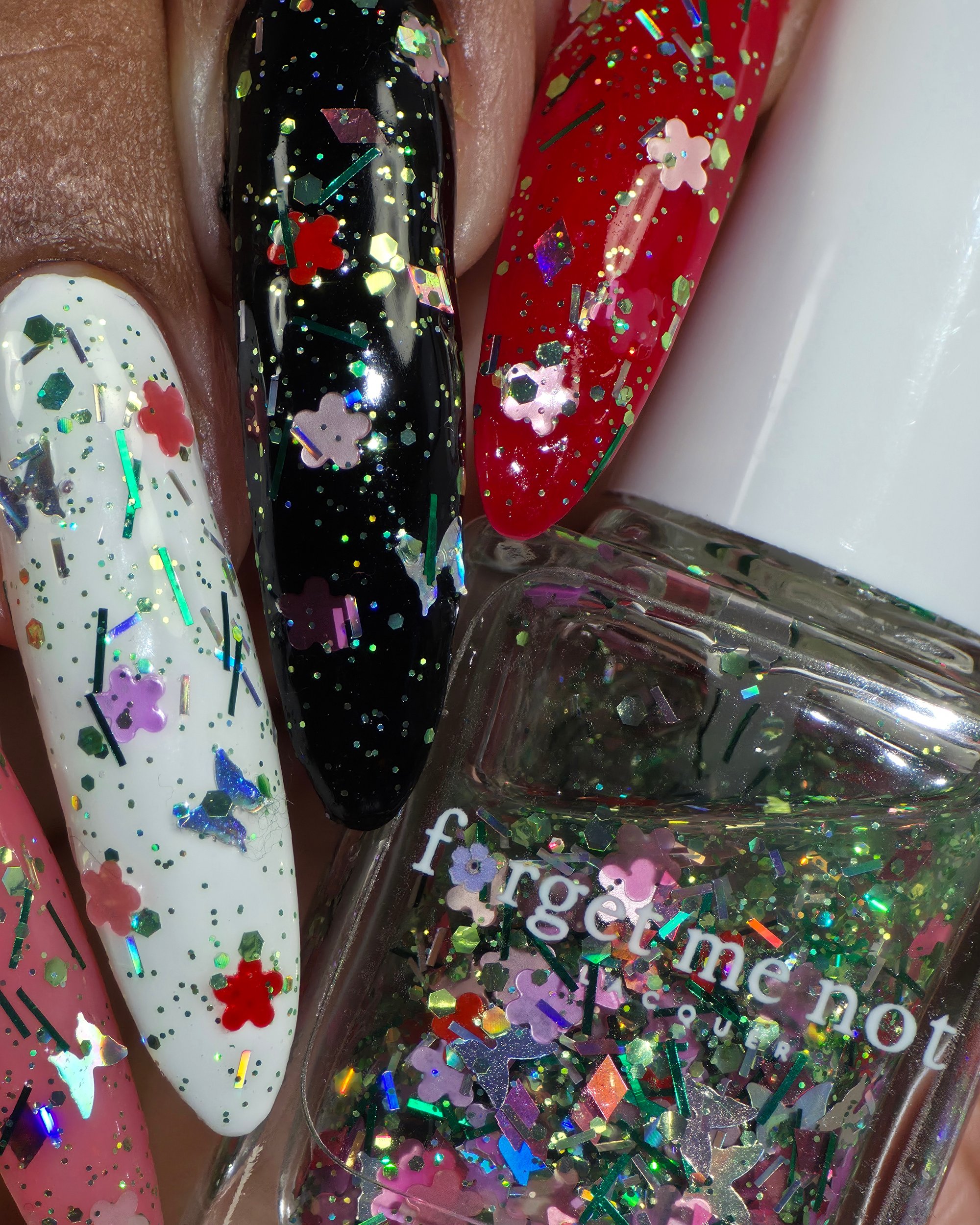 A joyful floral topper filled with tiny petals of spring. Shades of pink, red, and purple blossoms drift through a clear base alongside flashes of green holographic sparkle, airy silver and green shreds, delicate kite and butterflies shaped glitters that dance across the nail.