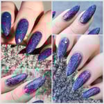 Glide into winter with this chilly-to-cozy thermal jelly that shifts from a frosty deep blue when cold to a crystal-clear “warm-up” finish as temperatures rise. Scattered inside are red-to-pink-to-orange opal flakes that flicker like sunset light on fresh ice, blue reflective glitter that flashes like skate blades catching rink lights, and inky microflakes that add a whisper of contrast—like tiny shadows on snow.