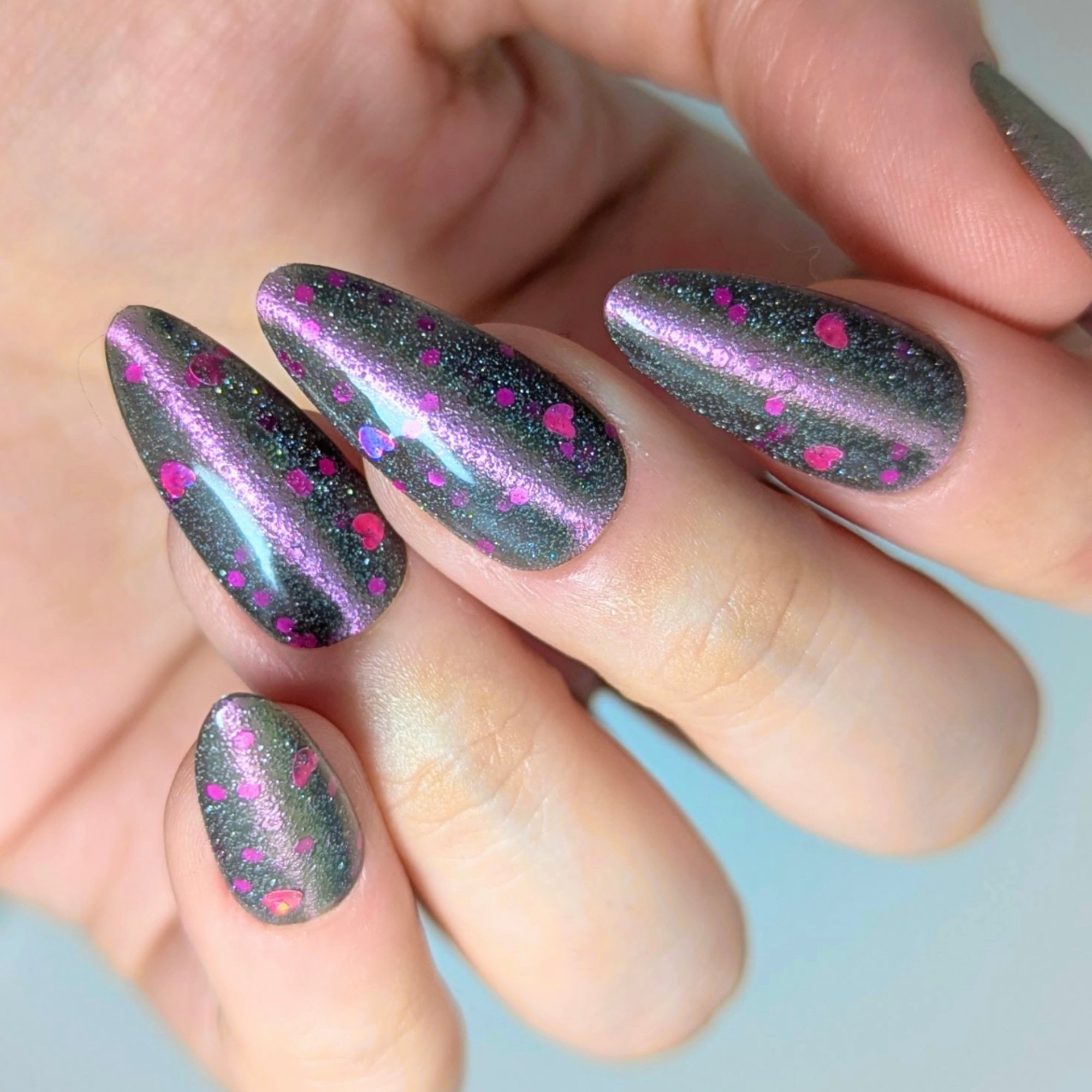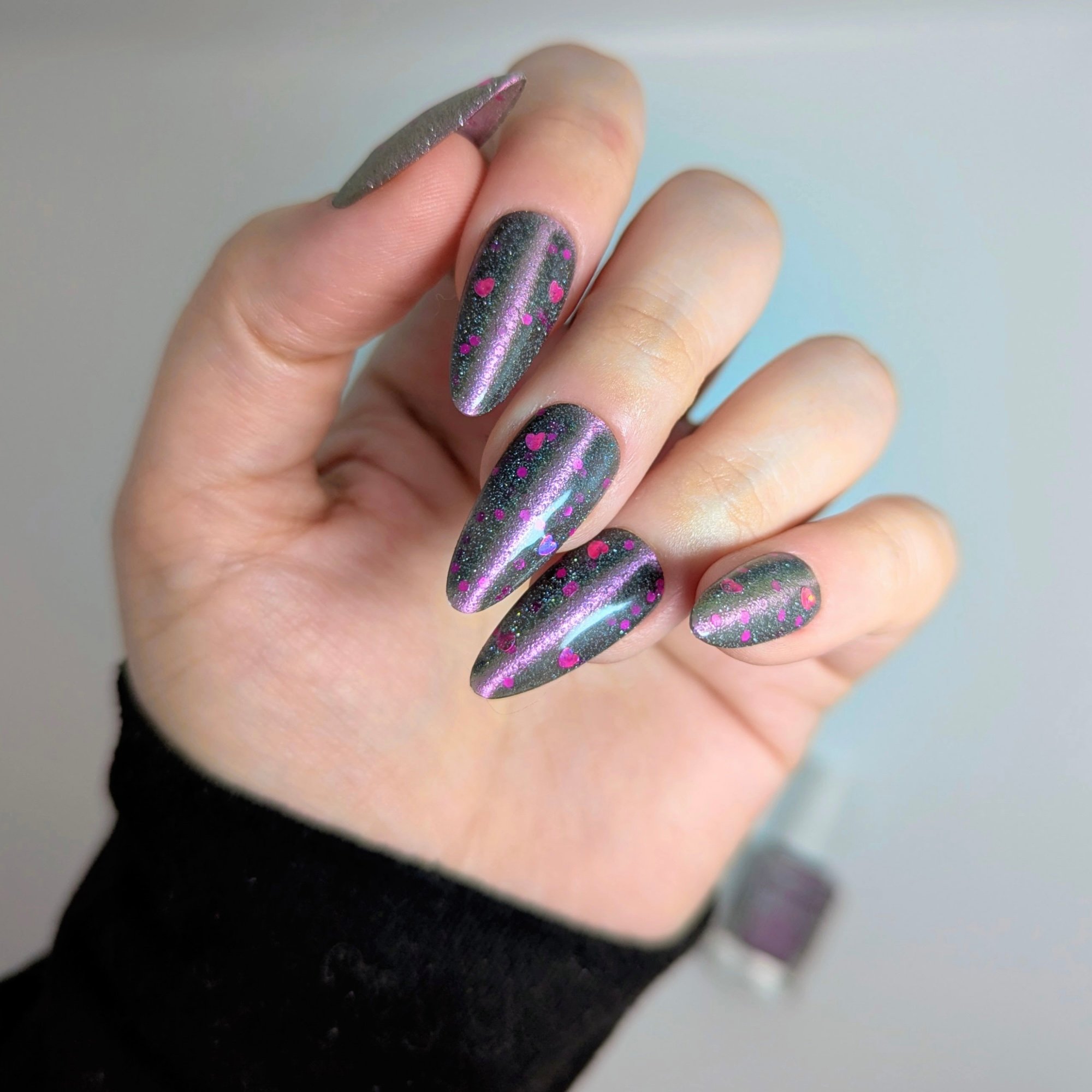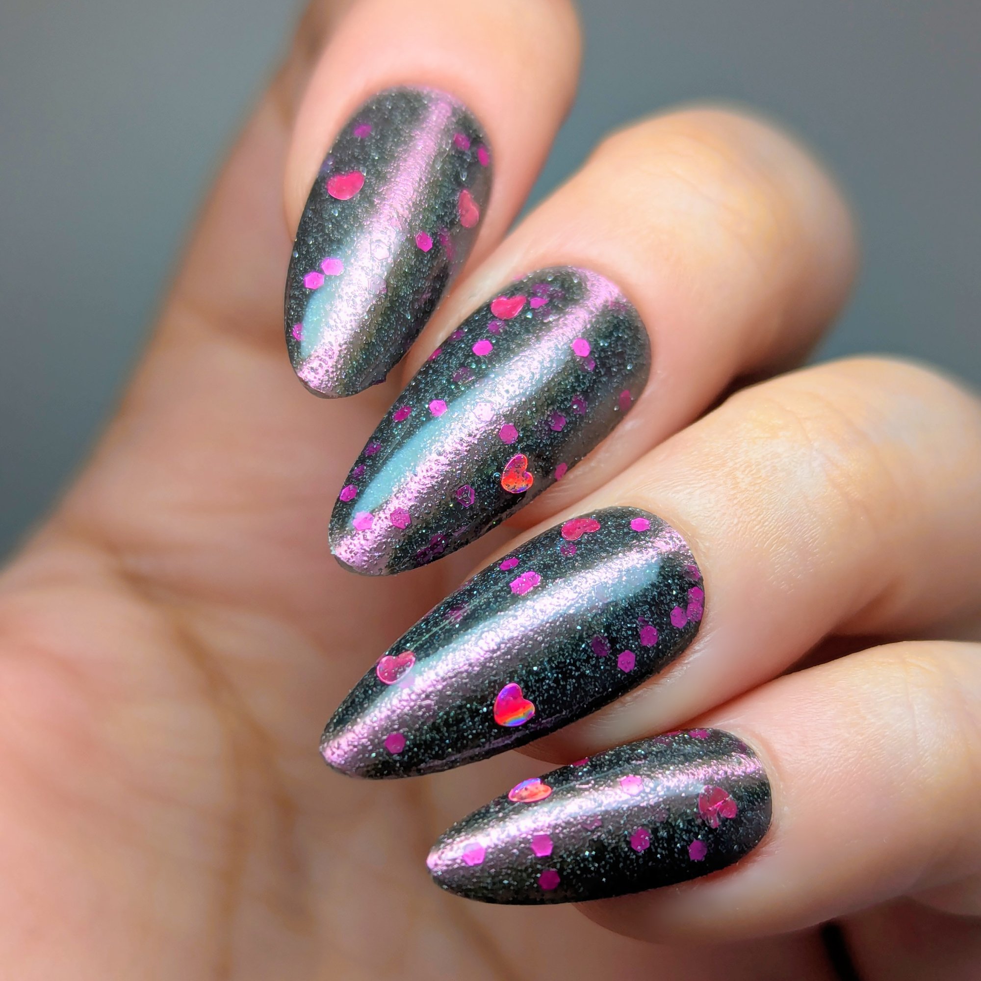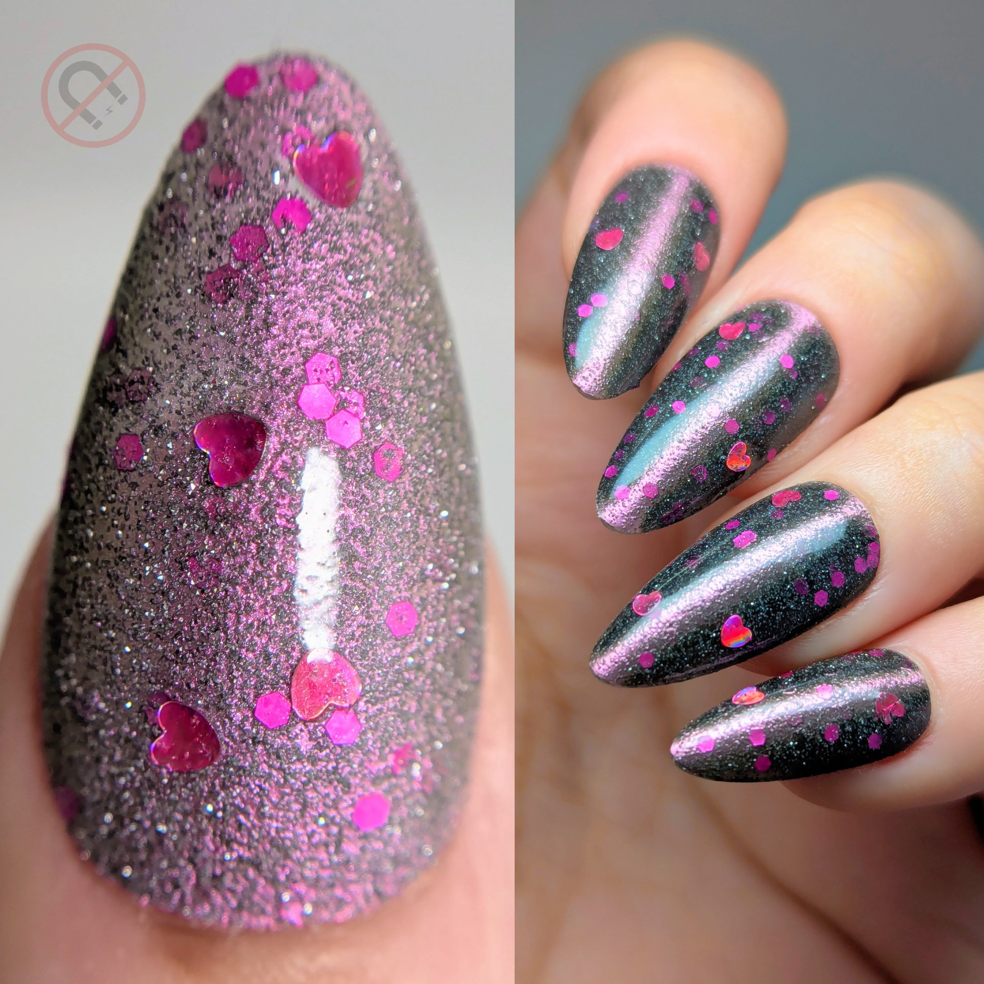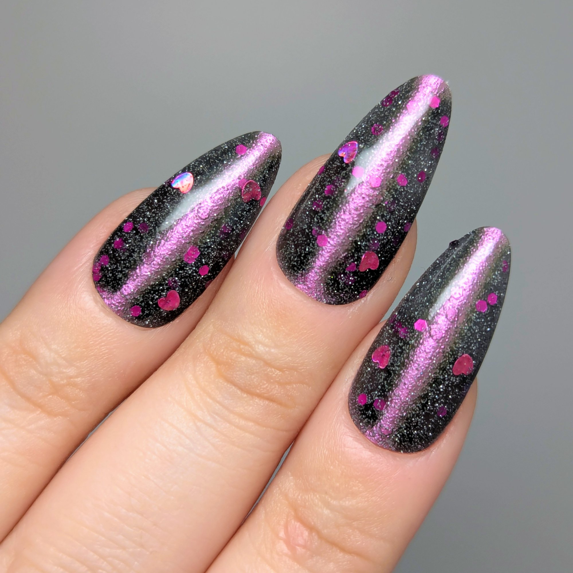 A sheer black/charcoal jelly base sets the mood, scattered with a delicate dusting of fine silver sparkle that twinkles like low light after dark. A soft pink magnetic stripe glides through the center, glowing with a quiet, romantic pull. Matte magenta accents and tiny hollow pink hearts float throughout, adding just enough flirtation to keep things interesting.