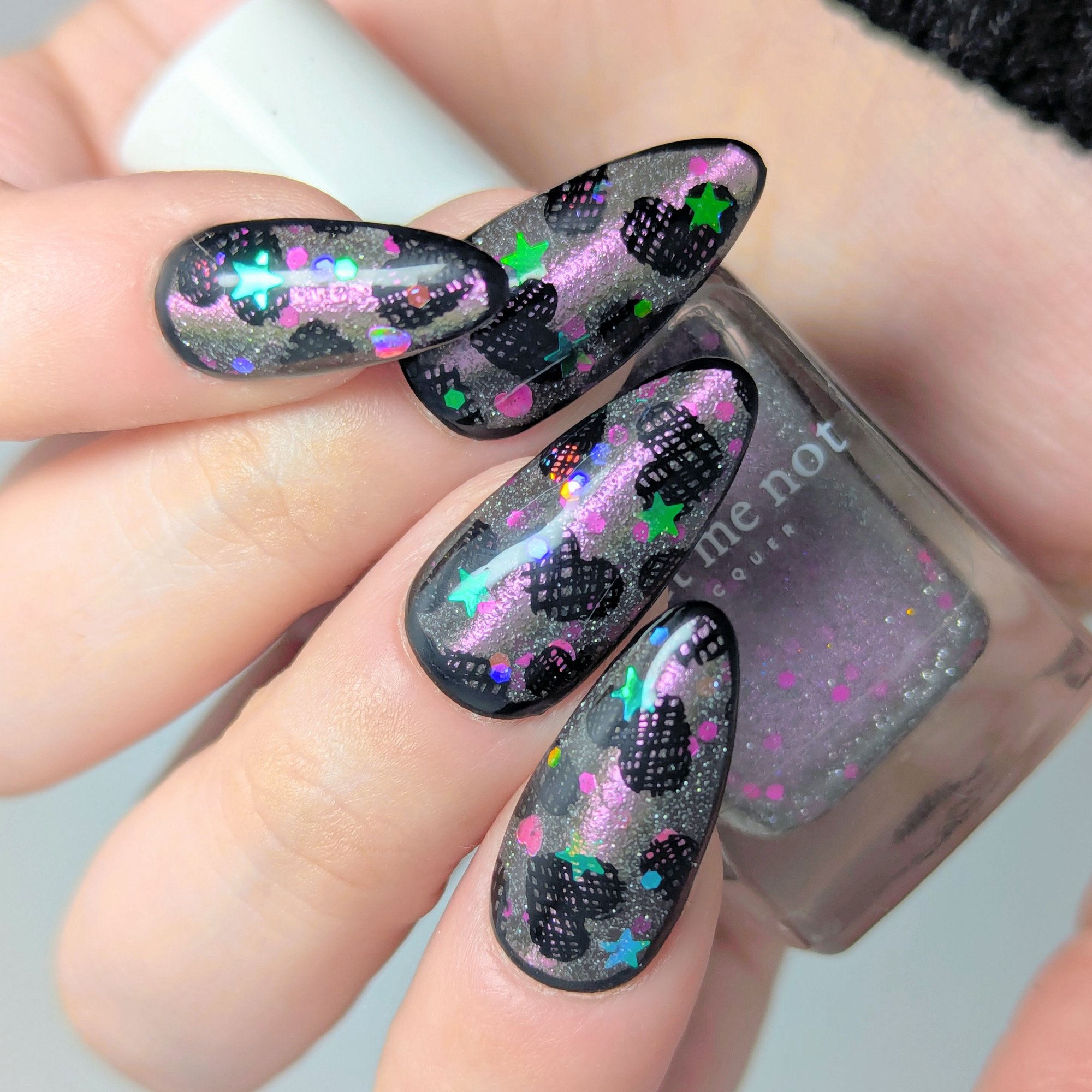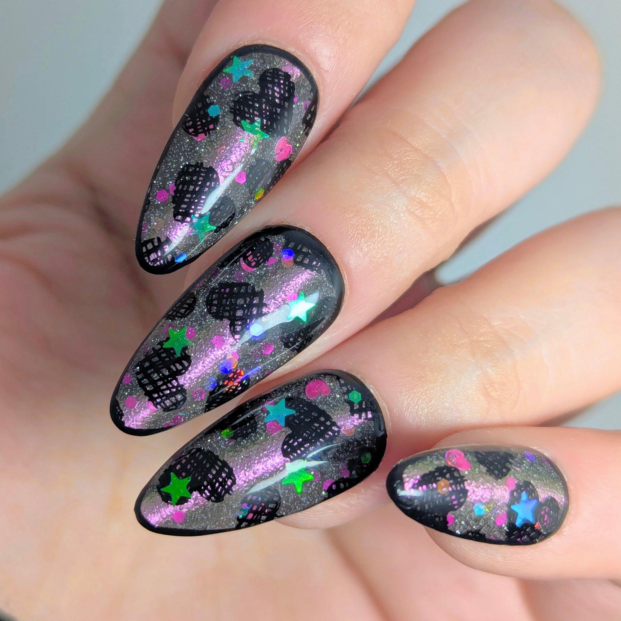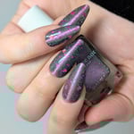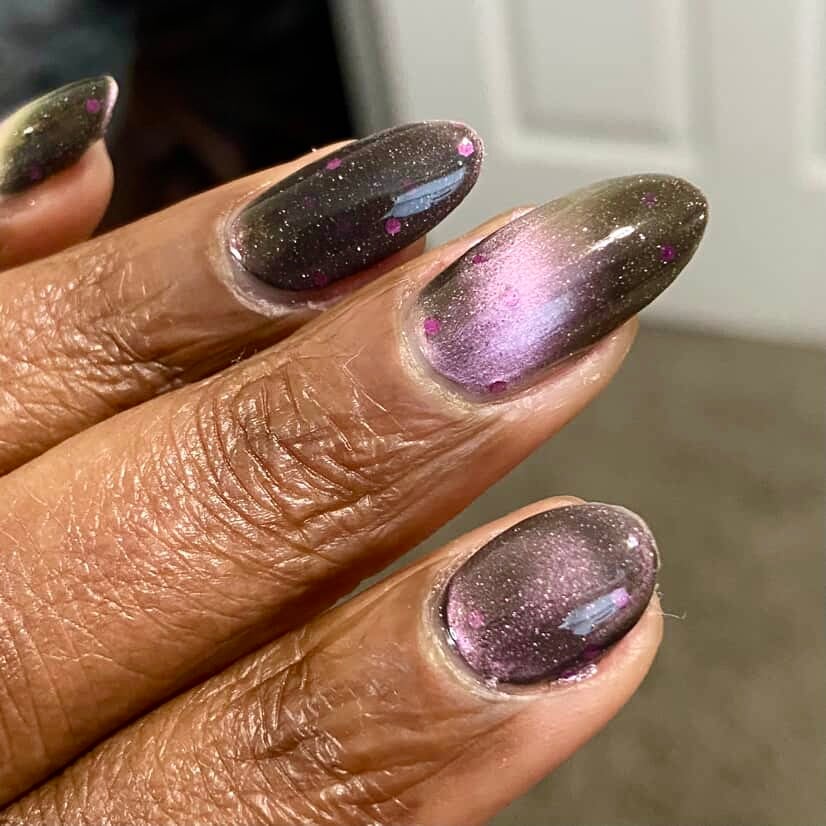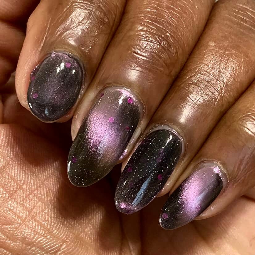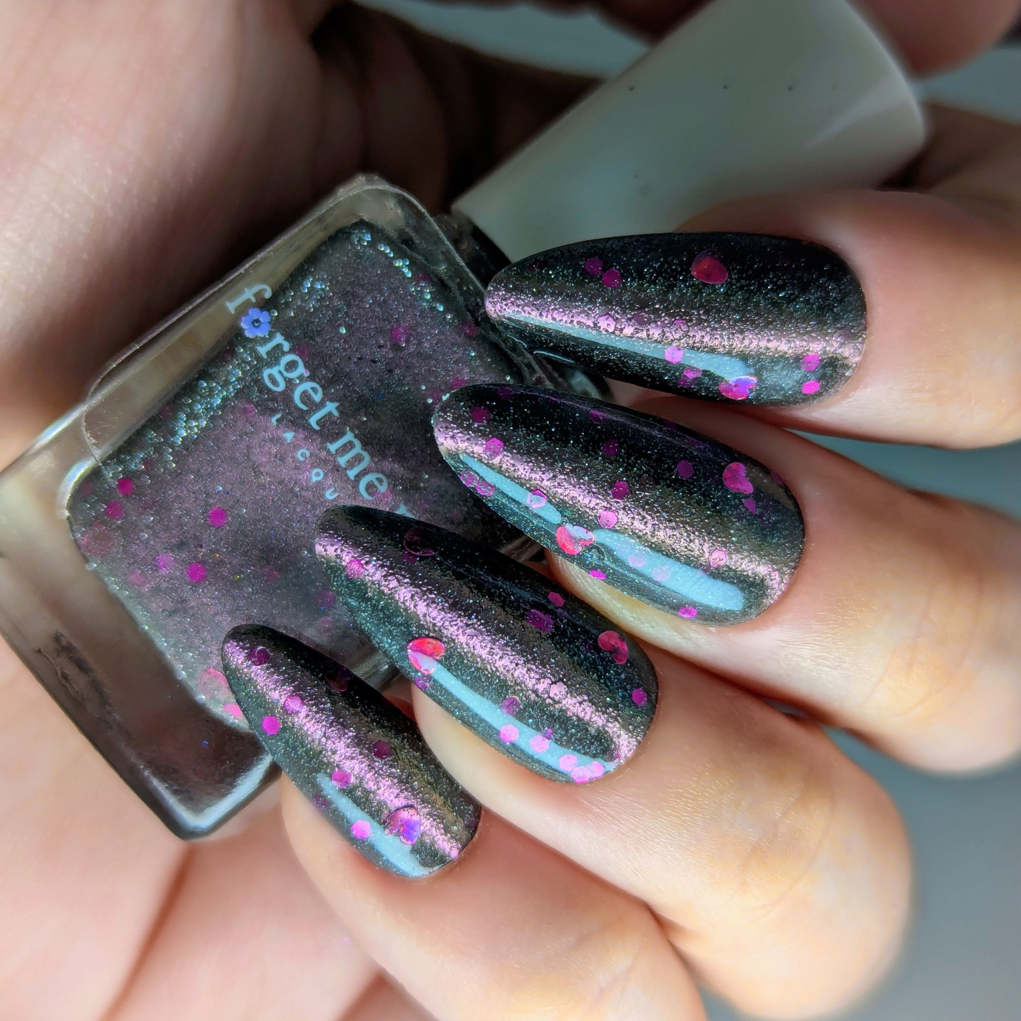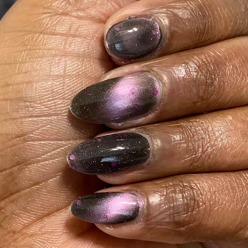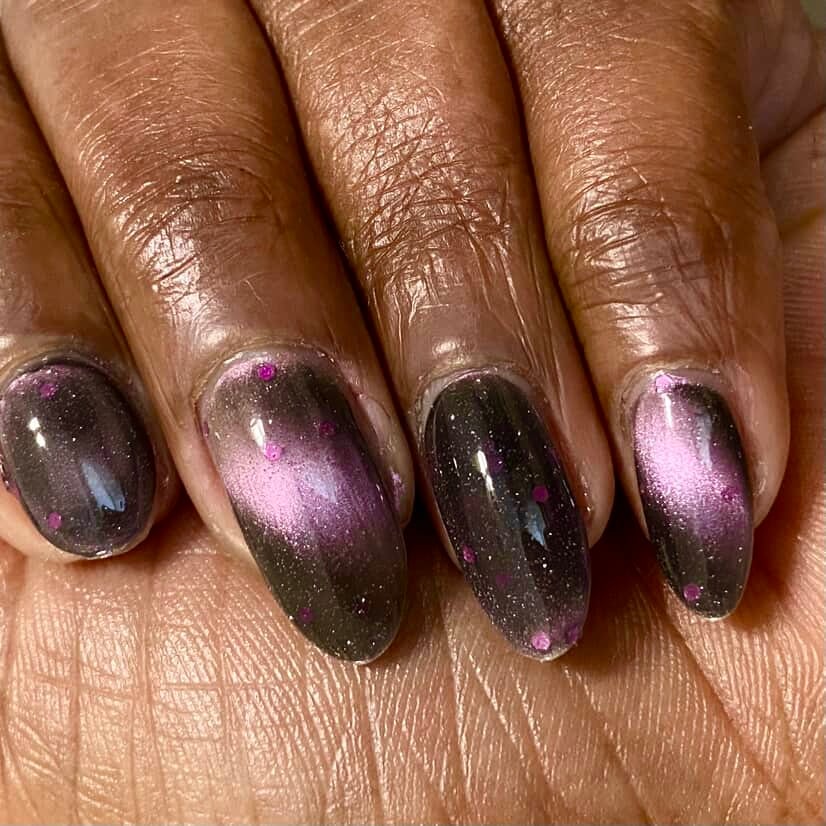 A sheer black/charcoal jelly base sets the mood, scattered with a delicate dusting of fine silver sparkle that twinkles like low light after dark. A soft pink magnetic stripe glides through the center, glowing with a quiet, romantic pull. Matte magenta accents and tiny hollow pink hearts float throughout, adding just enough flirtation to keep things interesting.