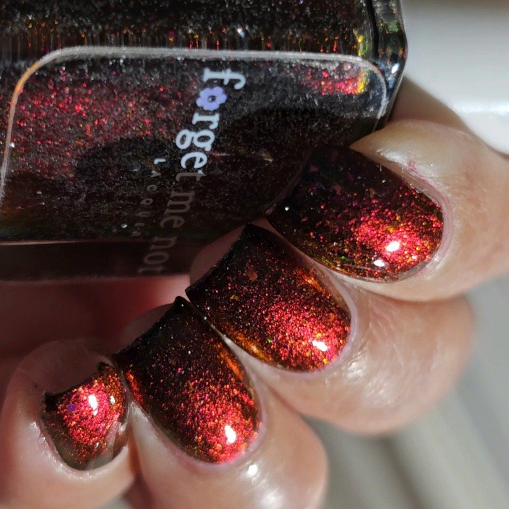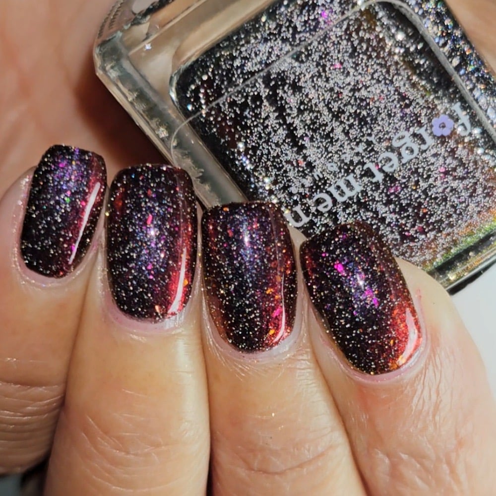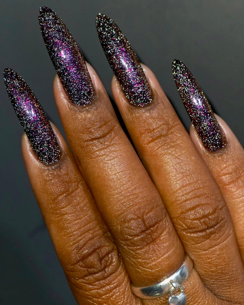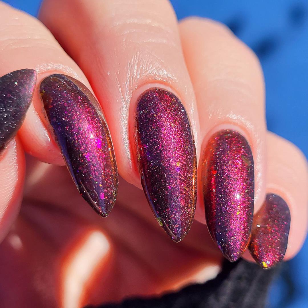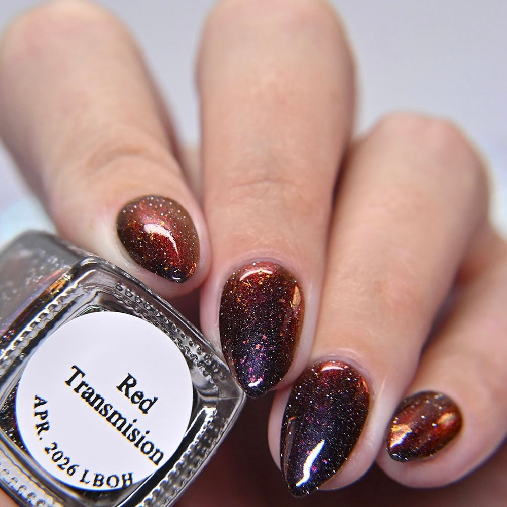 Inspired by the glowing red cosmic vortexes seen throughout Twilight Zone imagery, this shade captures the moment a dimensional anomaly. A black -to- red multi-chrome base infused with scattered silver reflective glitters and multi-tone chameleon flakes that mimic cosmic static. A surreal, fiery distortion of color, something you might glimpse just before reality bends.