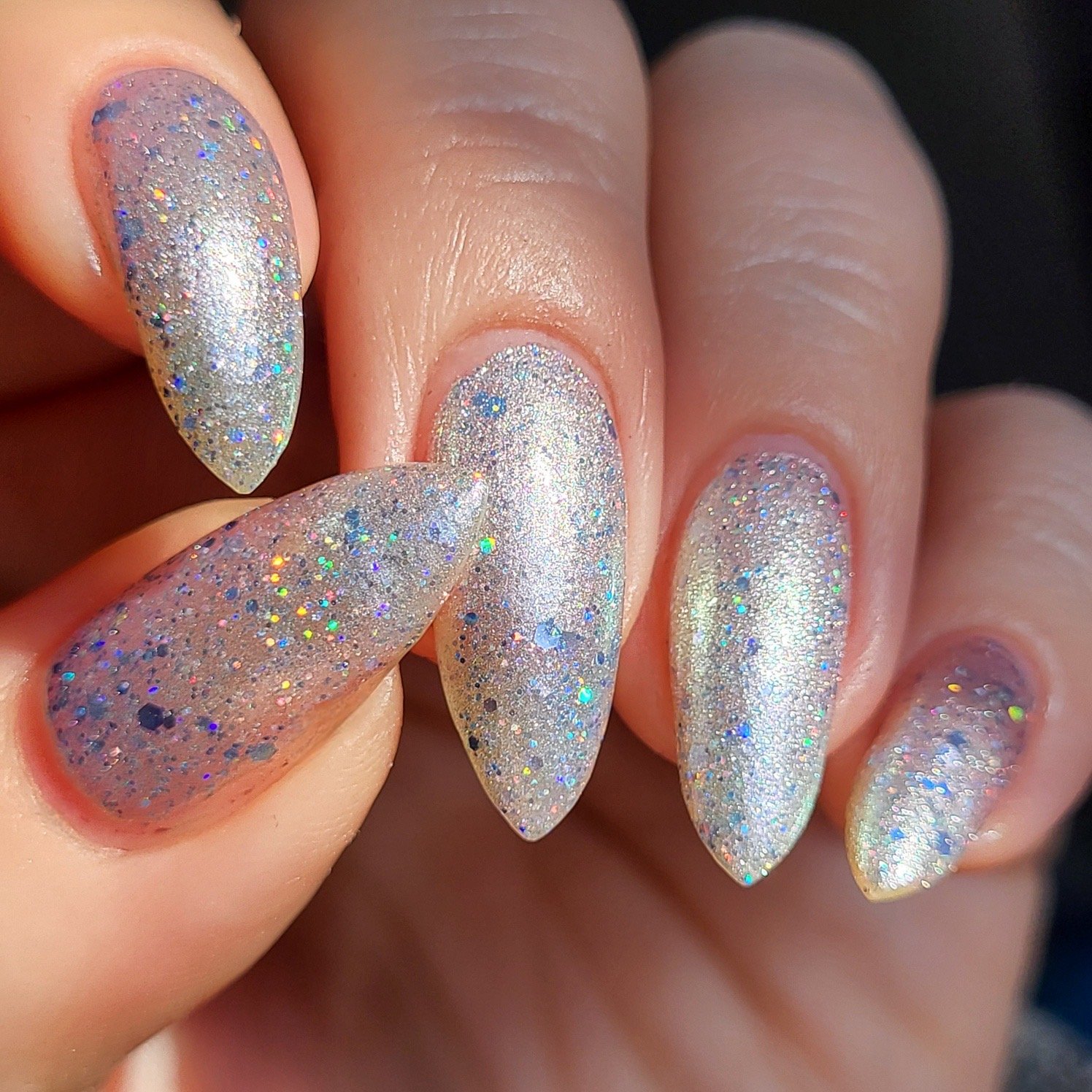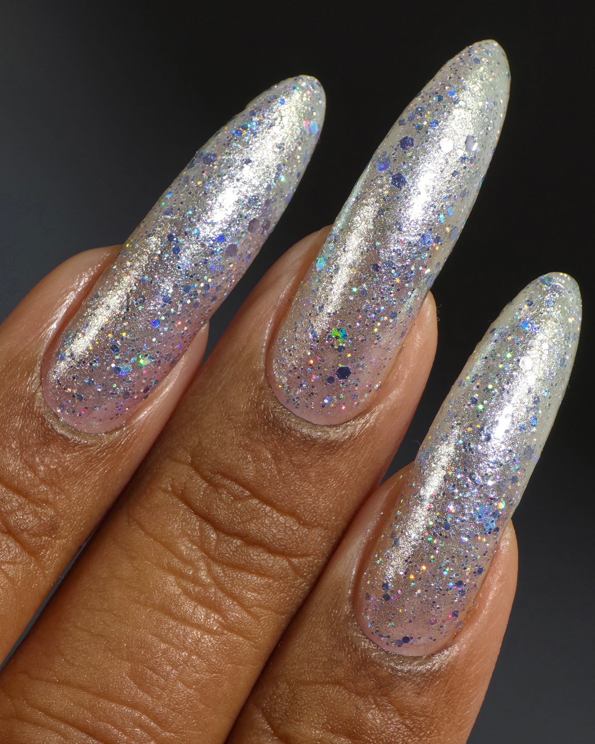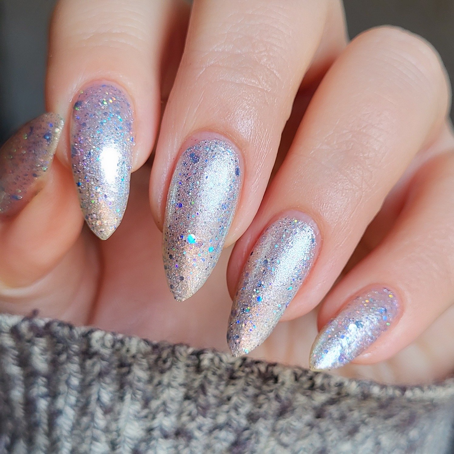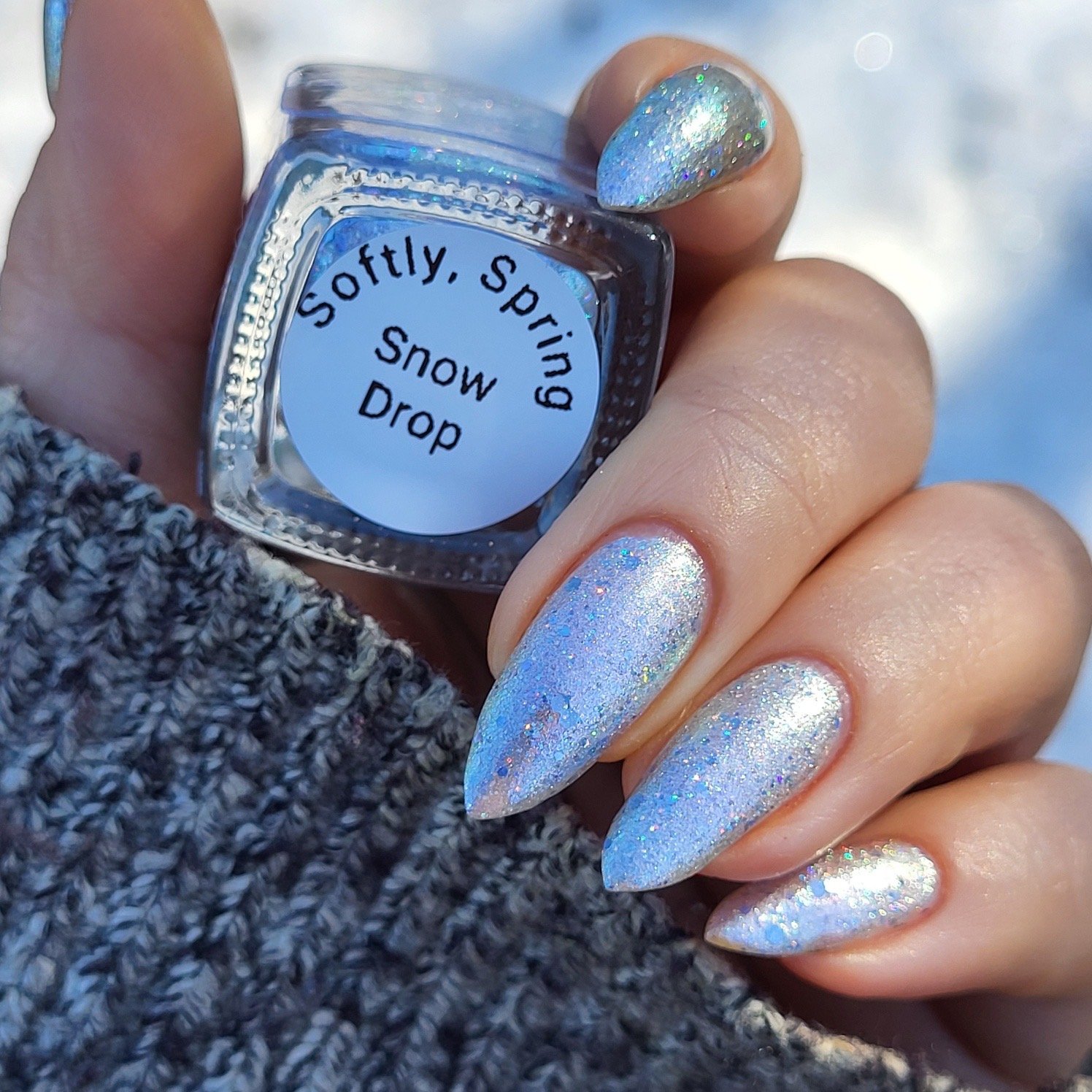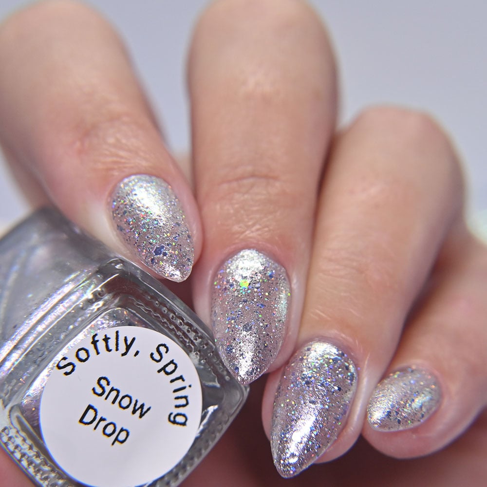 A cool white shimmer base with a soft shifting glow. Scattered holographic sparkle in varying sizes catches the light like melting frost on early spring petals.