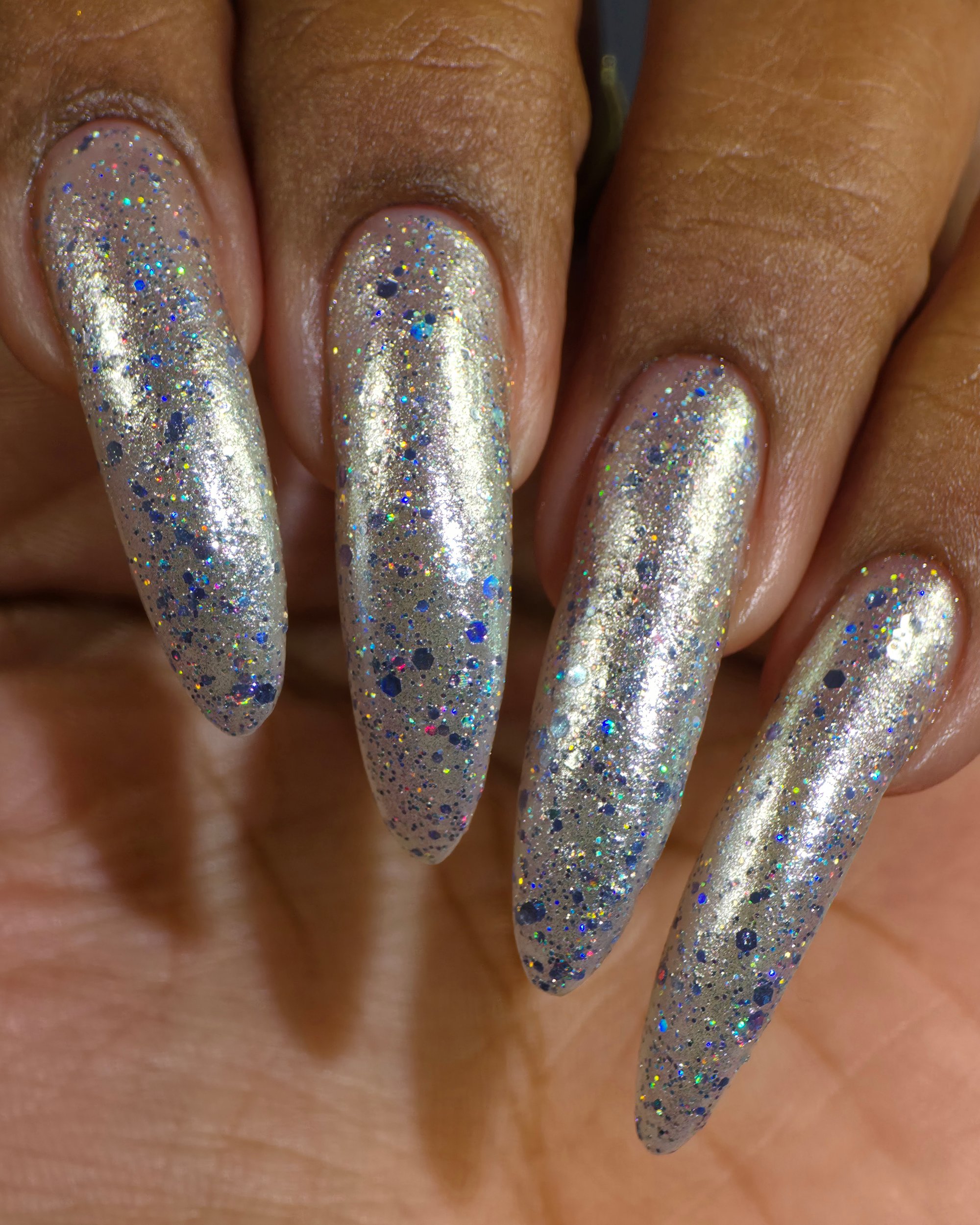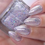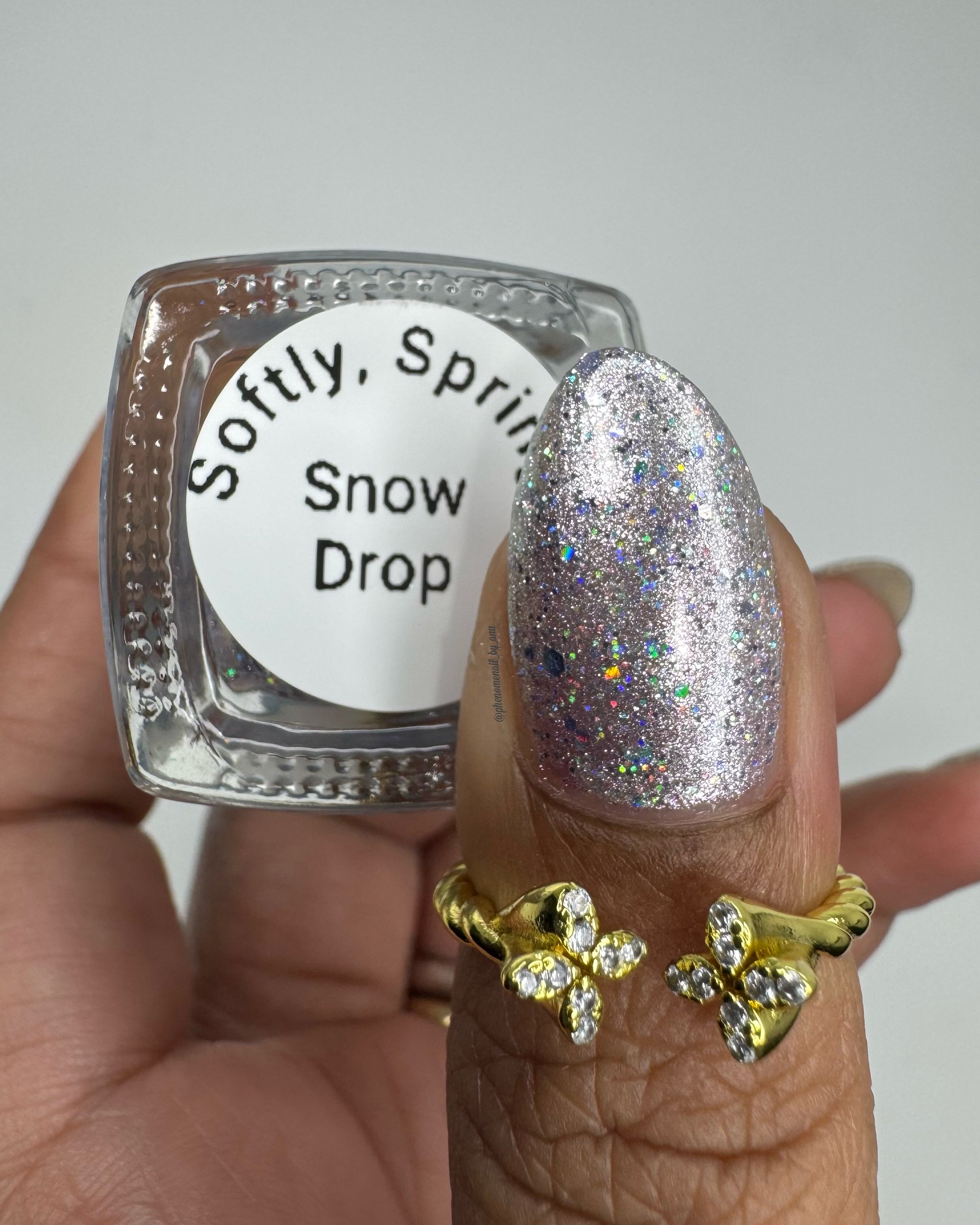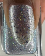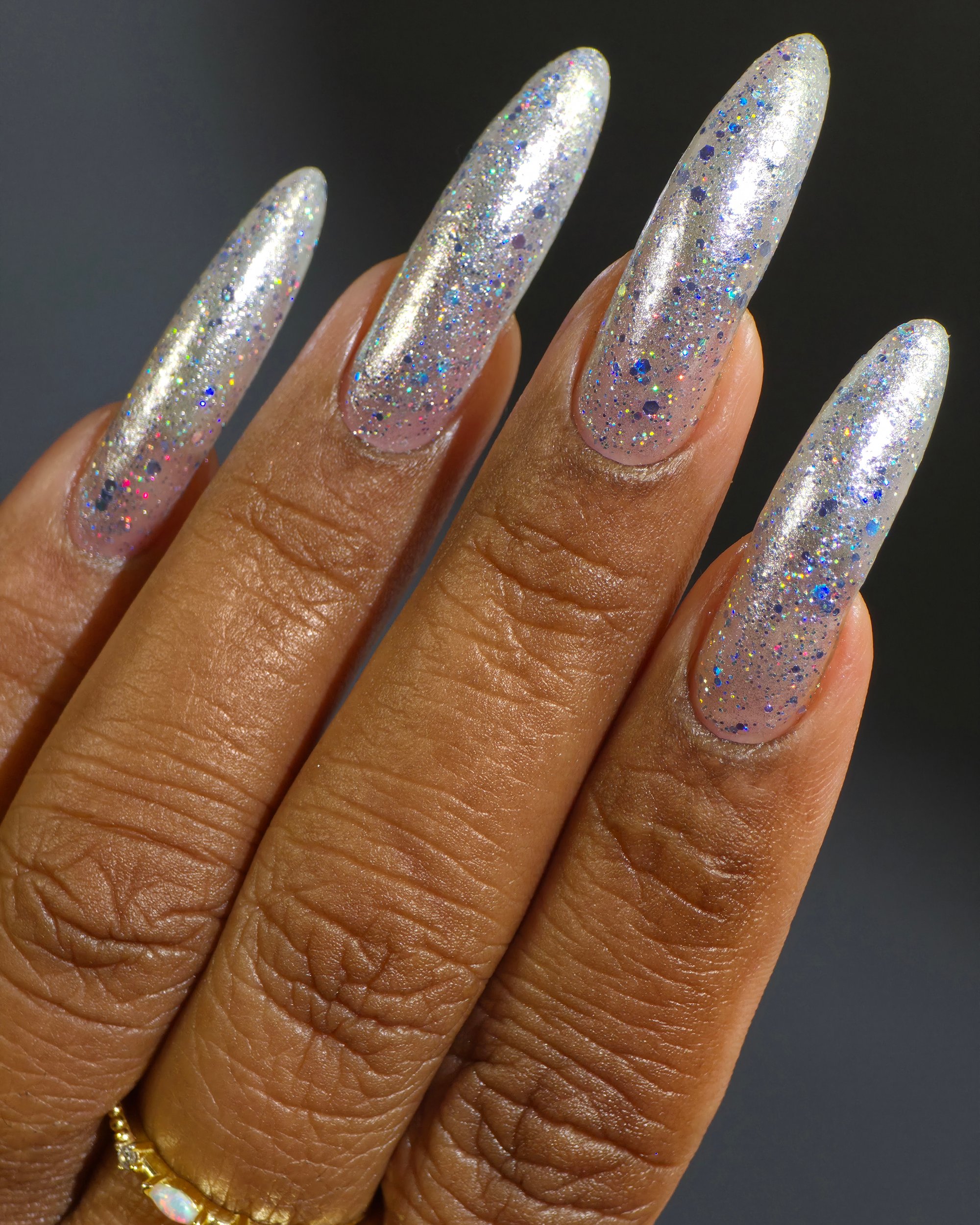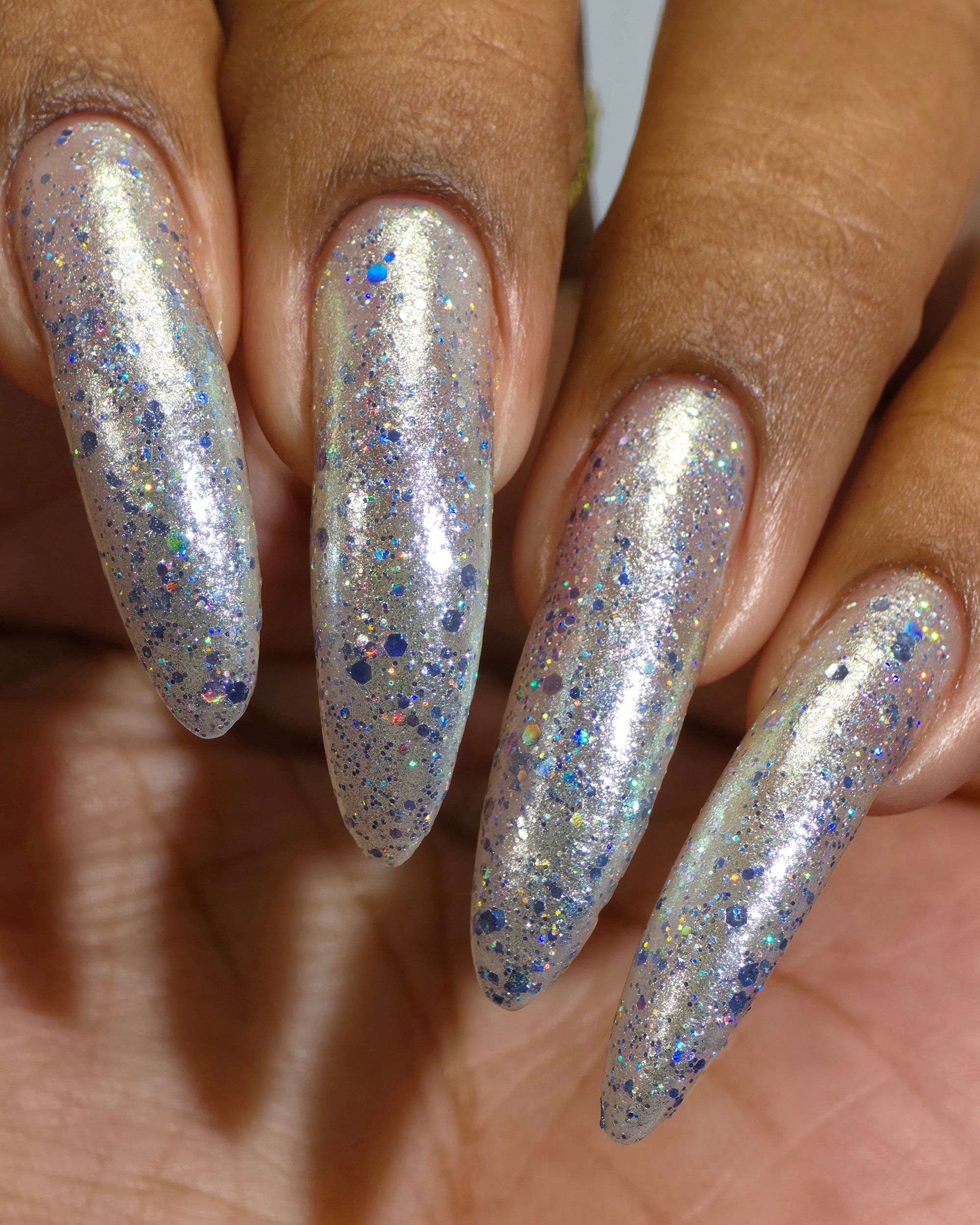 A cool white shimmer base with a soft shifting glow. Scattered holographic sparkle in varying sizes catches the light like melting frost on early spring petals.