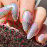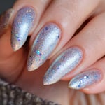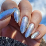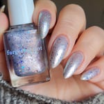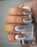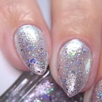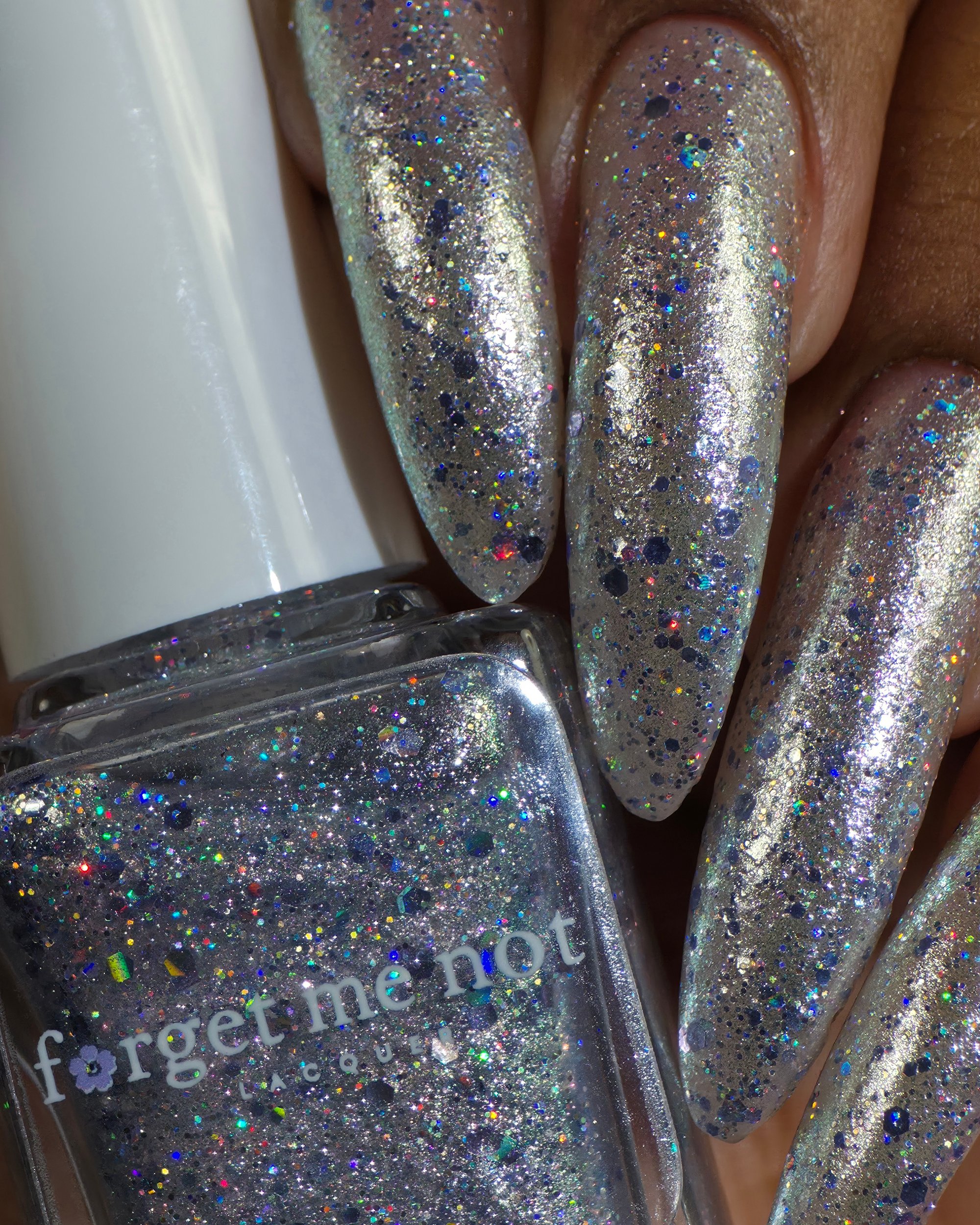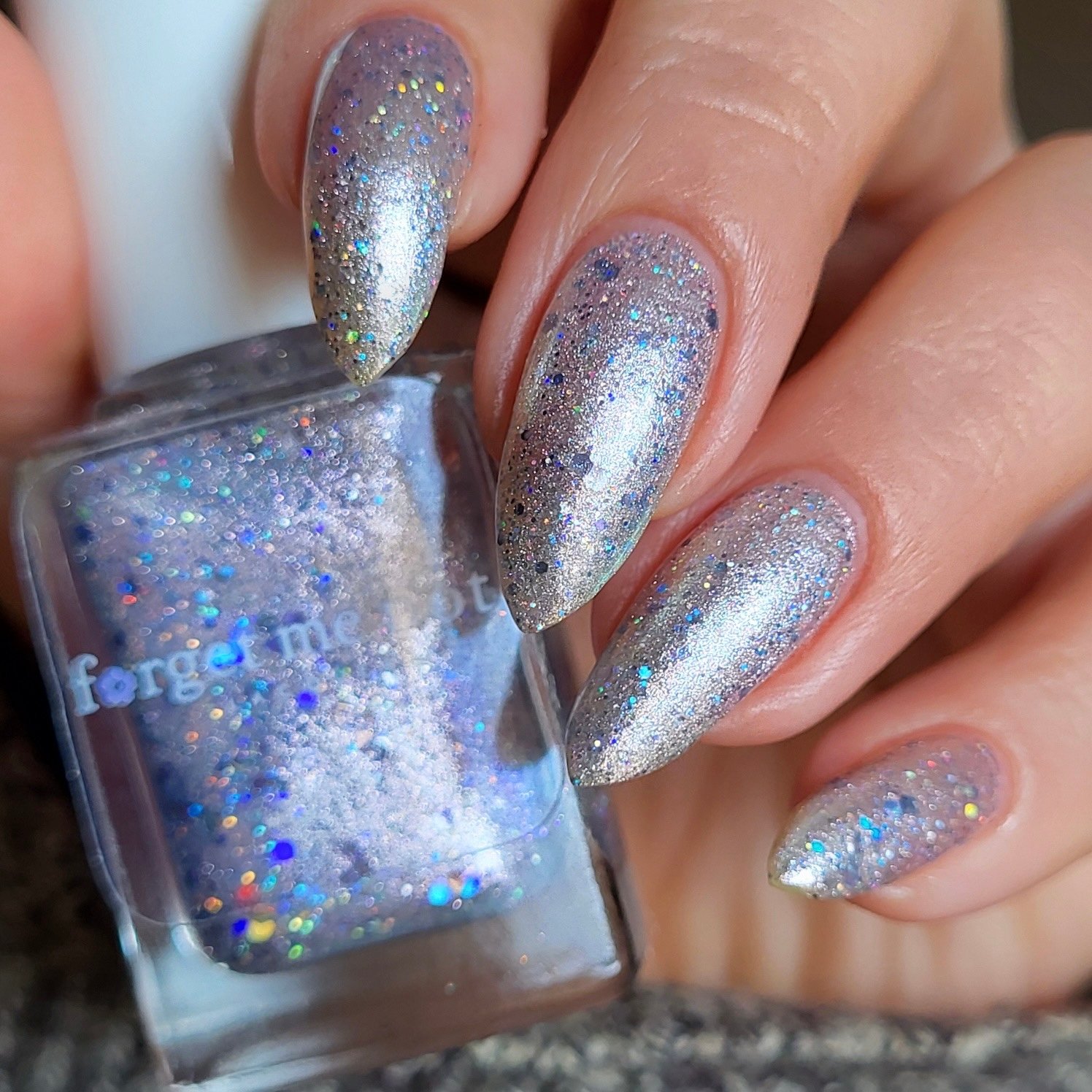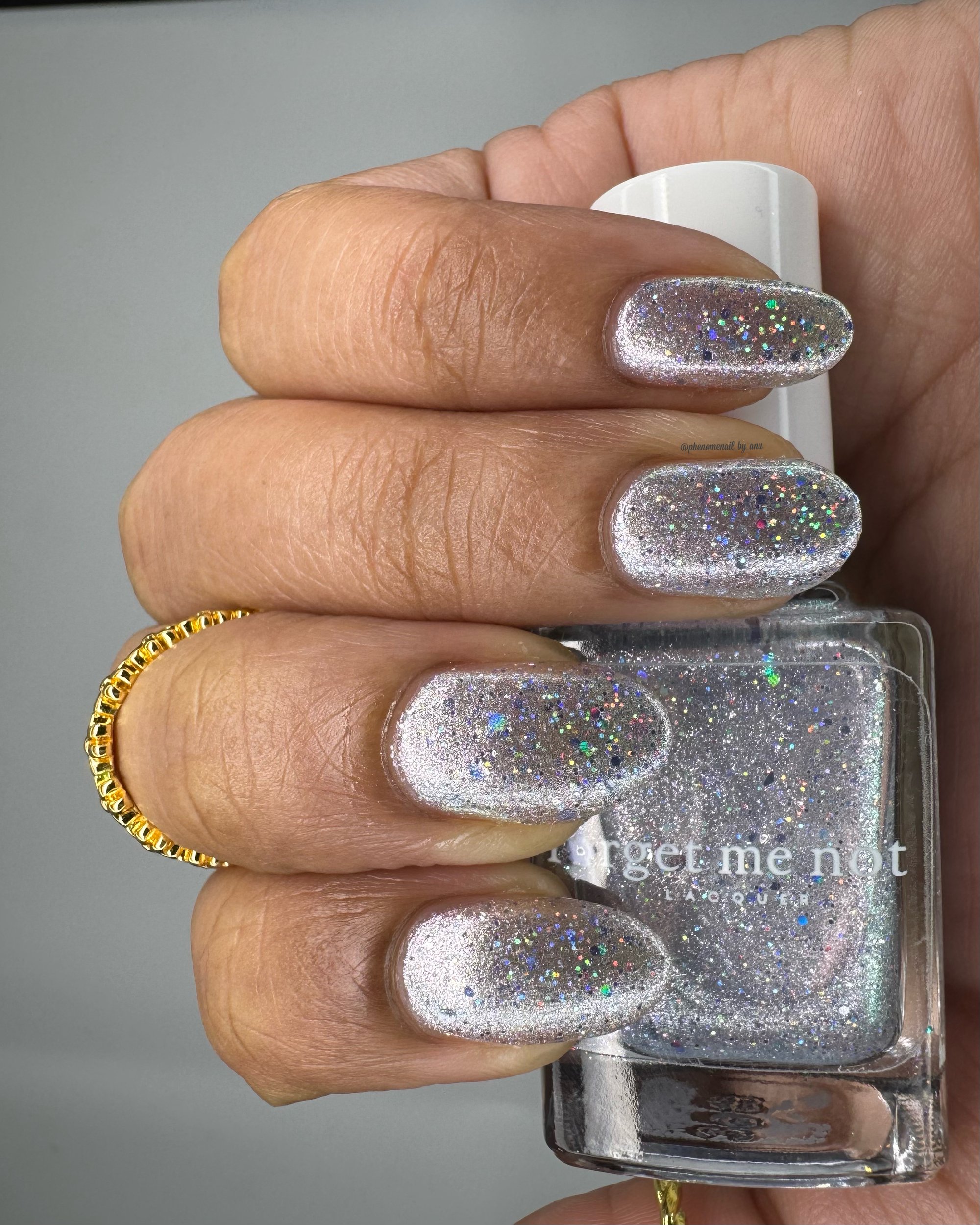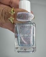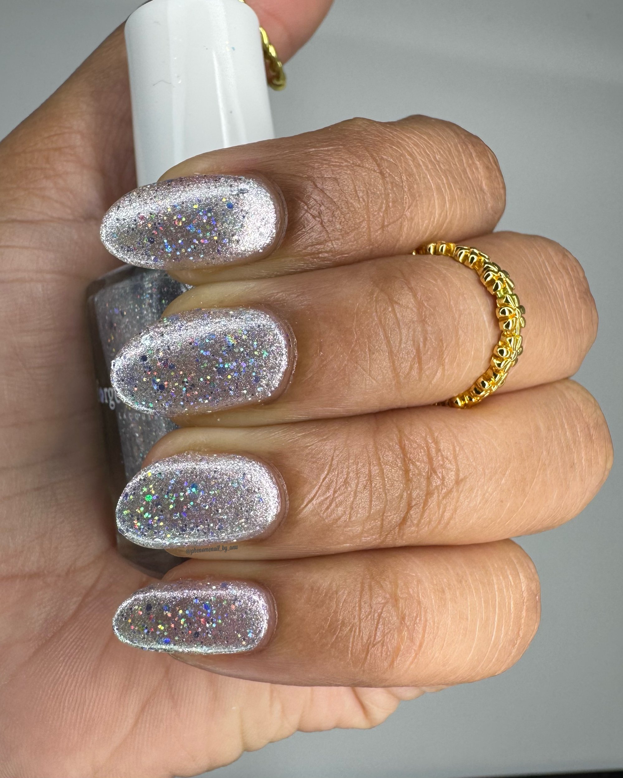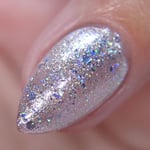 A cool white shimmer base with a soft shifting glow. Scattered holographic sparkle in varying sizes catches the light like melting frost on early spring petals.